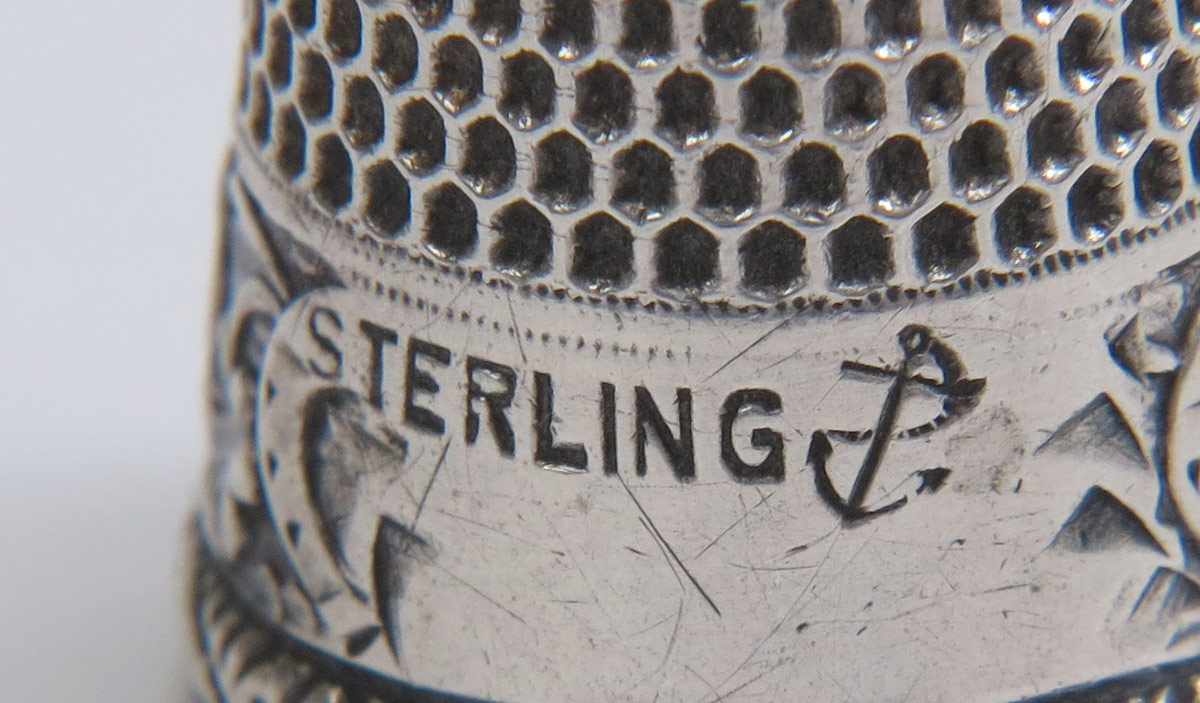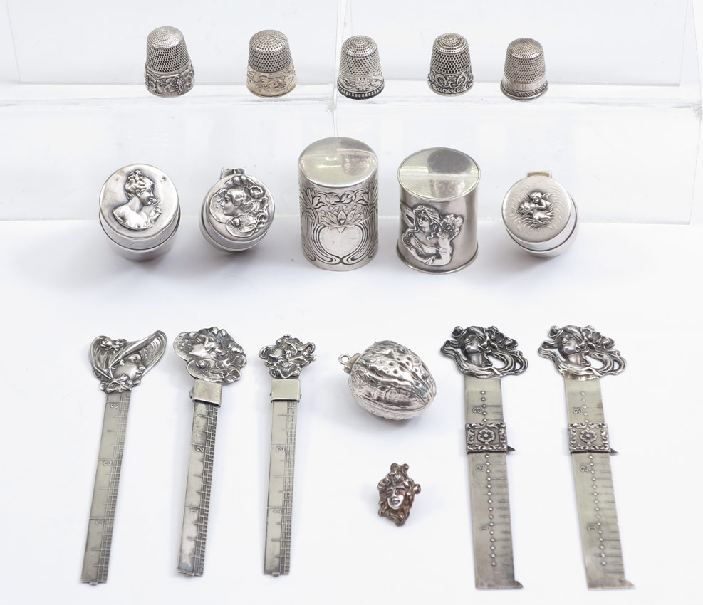 COLLECTION OF ART NOUVEAU STERLING SEWING ITEMS: 16 total pieces to include 1) 5 sterling sewing measures or hemmers, 2 by Kerr, 3 by Unger Brothers. 2) 6 thimble cases, 4 including unique walnut shape by Unger Brothers, 1 by Fishel, Nessler & Co., 1 by Gorham. One monogrammed. 3) 4 thimbles including Ketchum McDougell and 3 unidentified. 4) Unmarked American lady face button. Approx. 5.7 troy oz.