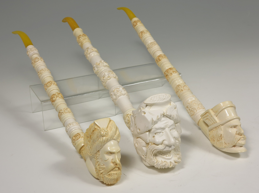 3 CARVED MEERSCHAUM PIPES: Carved figural head bowls with extended shafts, plastic tips. Largest measures 17 1/2'' long.
