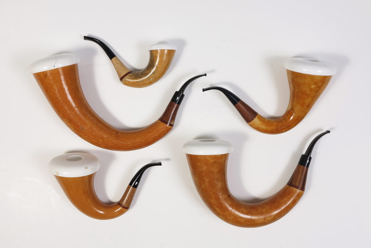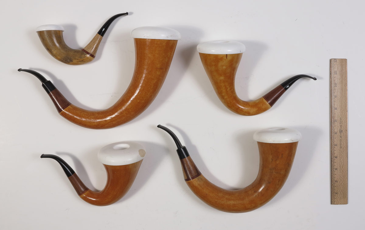 5 CALABASH PIPES: Each with a gourd body and meerschaum bowl. Favored by the studious type and Sherlock Holmes. Largest measures 13'' l. x 6 1/2'' x 4'' bowl dia.
