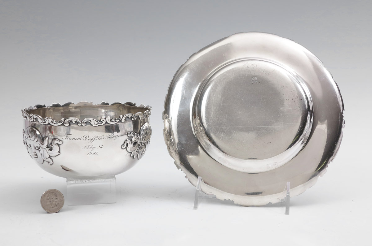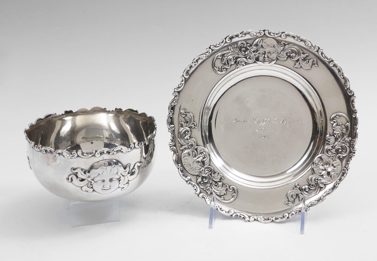 WHITING ART NOUVEAU STERLING BOWL AND UNDERPLATE: 2 pieces to include 1) Bowl with applied child's face and floral rim, 2 3/4'' h. x 5 1/2''. 2) Matching underplate, 7 3/4'' dia. Both pieces engraved Francis Griffiths Hogan, Feby. 25, 1901. Approx. 19.6 troy oz.
