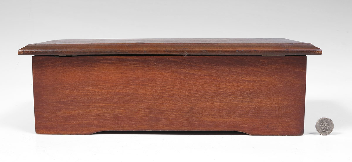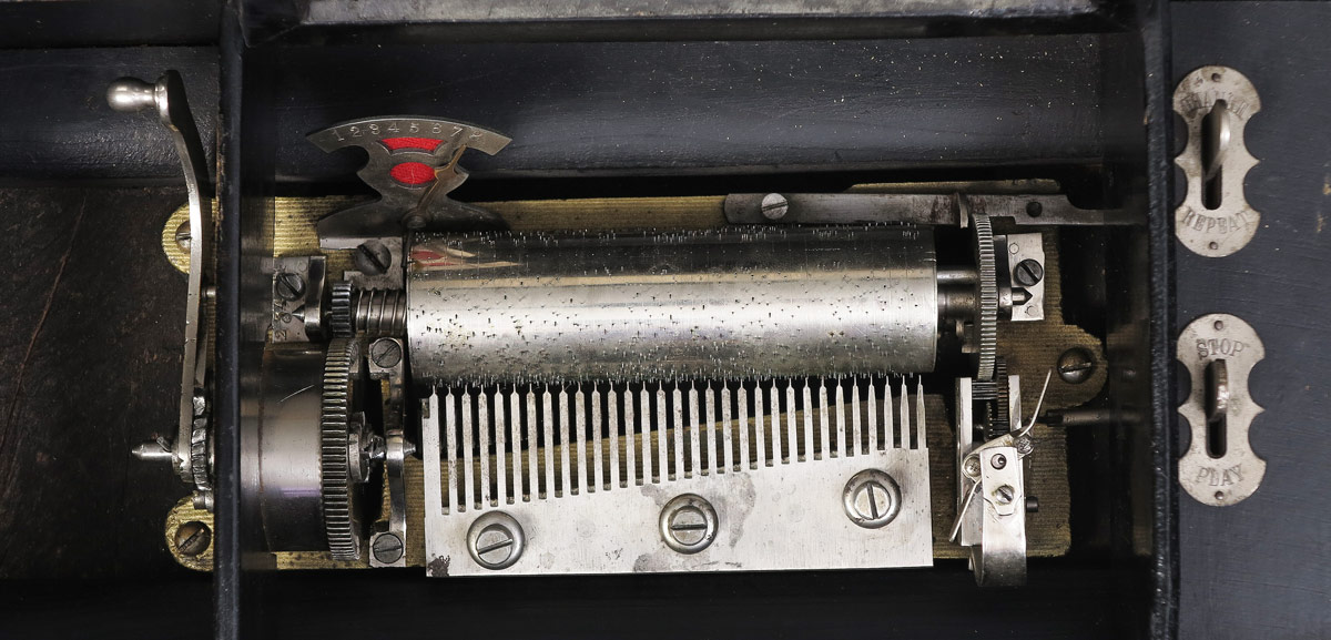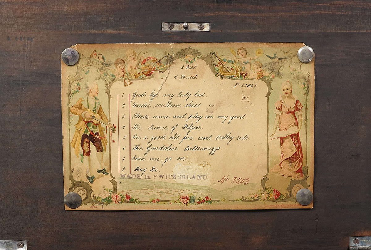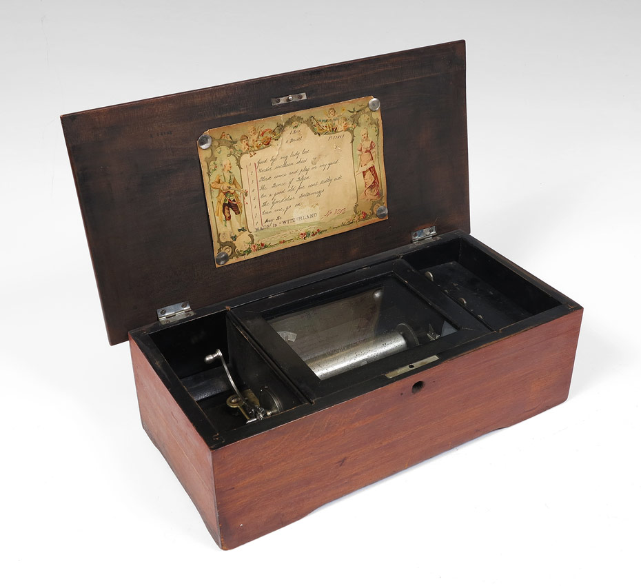 SWISS CYLINDER ROLL MUSIC BOX: Wood case, 8 song cylinder with original lithograph insert under lid. Marked Made in Switzerland on lithograph. Unmarked as to maker. Single comb with all teeth present. Overall measures 5'' h. x 15 1/2'' x 8''.