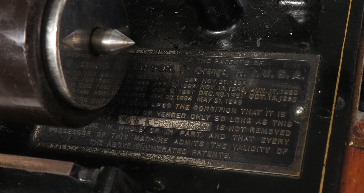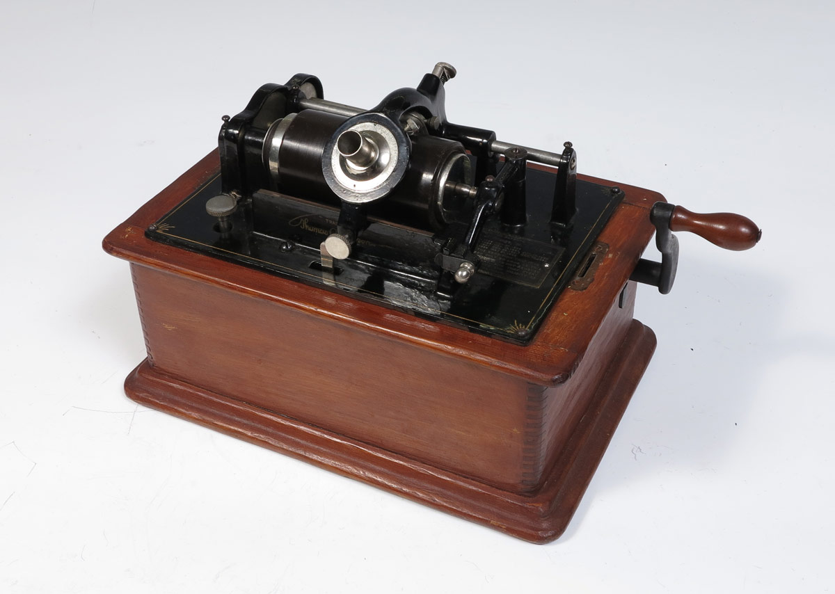 EDISON STANDARD CYLINDER ROLL PHONOGRAPH & HORN: Case missing stencil, serial number S146767, last patent date 1898. Model C Reproducer, no stylus. Sold with floral painted tulip horn with replaced tip. Case 11'' h. x 12 1/4'' x 9'', horn 26 1/4'' x 19''.