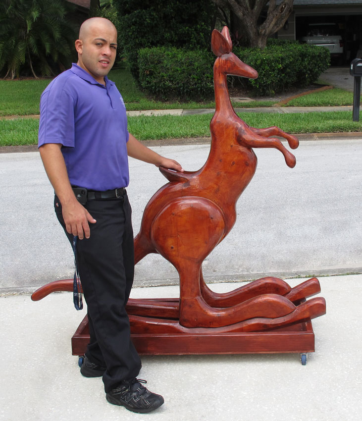 AUSTRALIAN FOLK ART LIFE SIZE ROCKING KANGAROO: A unique life size rocking kangaroo, removable from wood base with castors. Kangaroo 62 1/2'' h. x 62 1/2'' x 16'', base 6 1/2'' h. x 24'' x 47 3/4''.