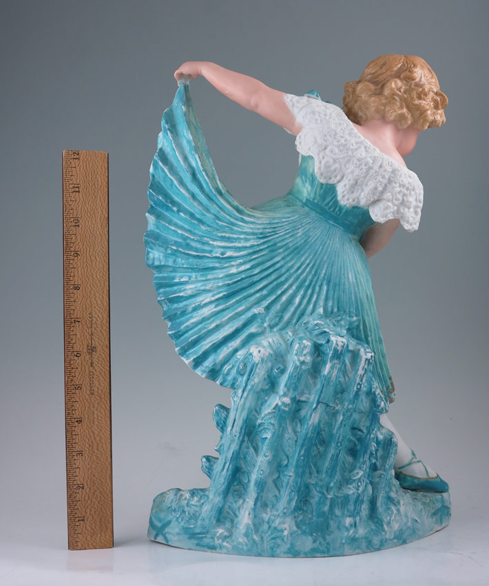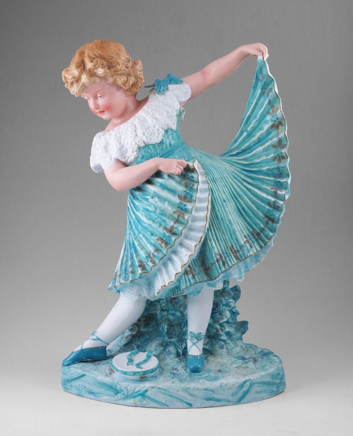 15'' HEUBACH GERMAN BISQUE FIGURINE: Young girl in a dance pose with tambourine at her feet. Impressed rising sun mark. Measures approx. 15'' tall x 10'' wide at the base.