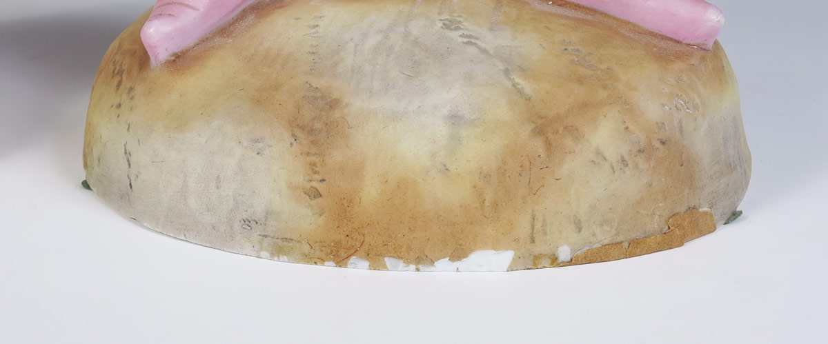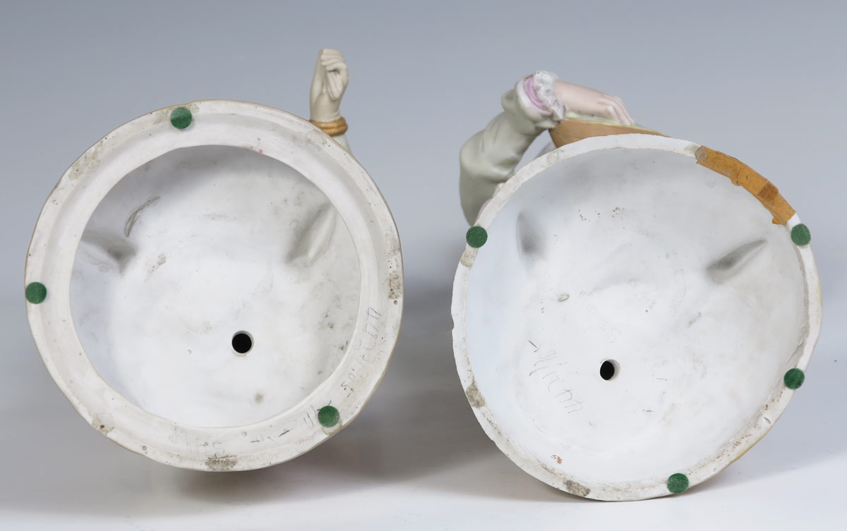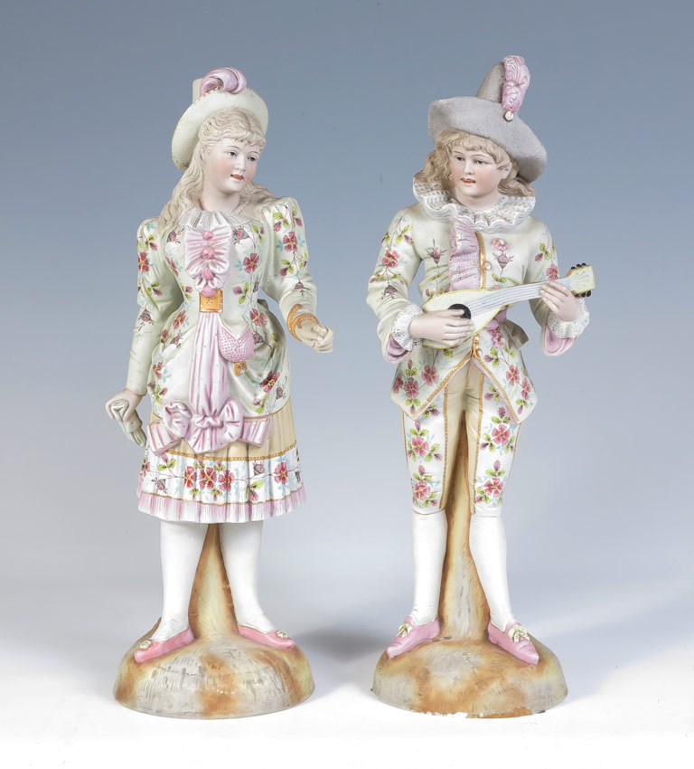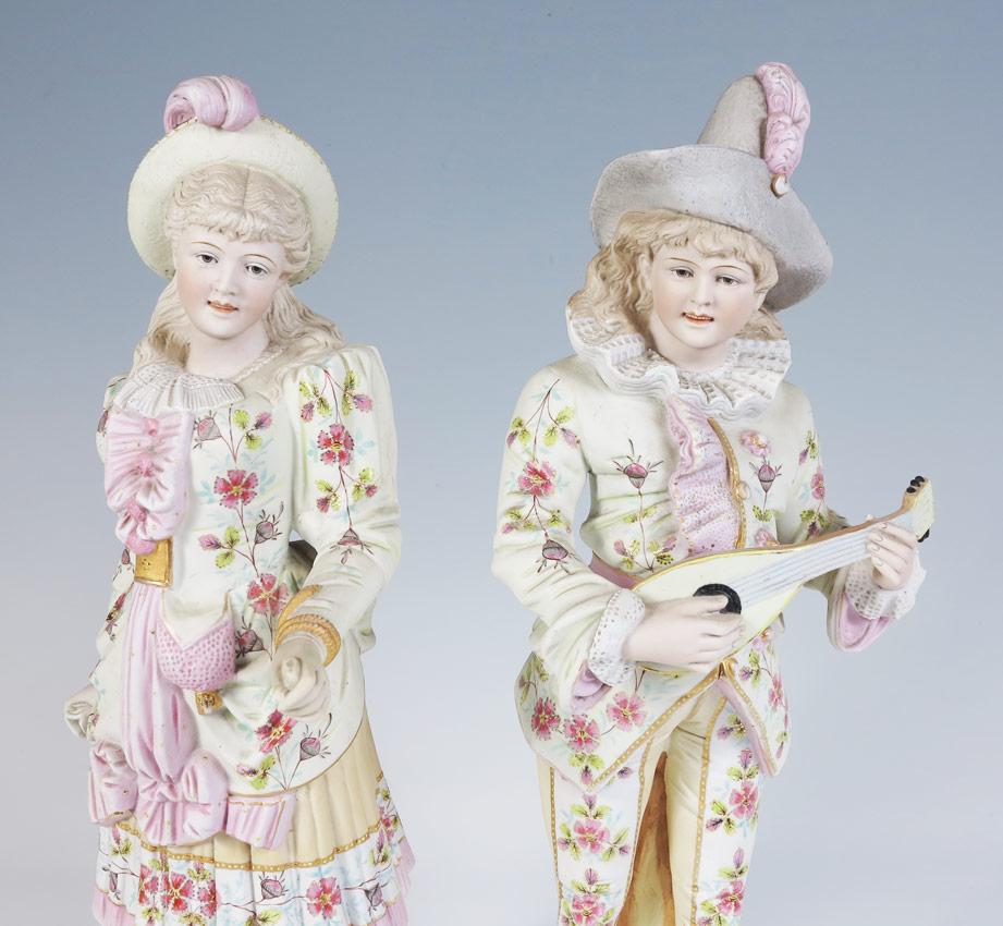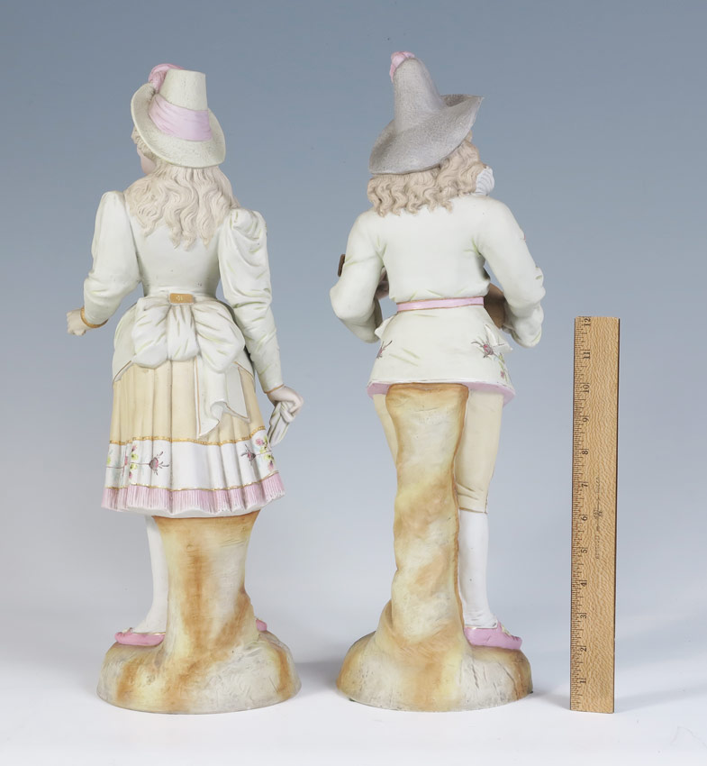 2 LARGE BISQUE FIGURINES: Figure of a young man playing a string instrument and young maiden dressed in finery. Marked on base with 5 and illegible mark, also pencil markings underneath both. Larger of the 2 measures 20 1/2'' h. x 6 3/4'' dia.