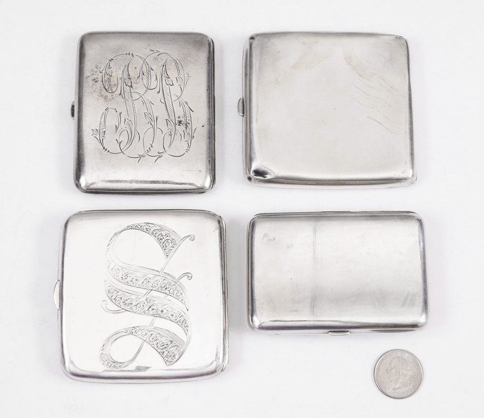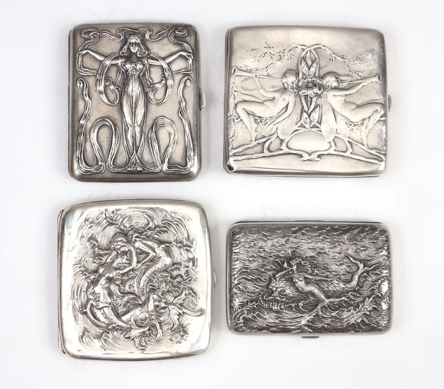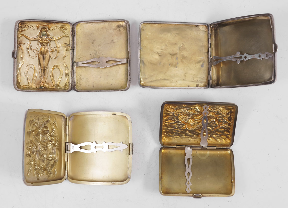 4 ART NOUVEAU STERLING CIGARETTE CASES: 4 pieces total to include 1) Mauser two women blowing horns. 3 1/4'' x 3 1/2''. 2) Sterling, 3 mermaids playing, monogrammed. 3) Sterling, woman blowing shell riding on sea creature in waves. 4) Blackington, standing woman with outstretched arms, monogrammed. Approx. 12.6 troy oz.