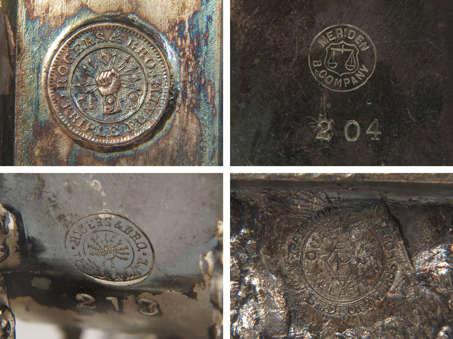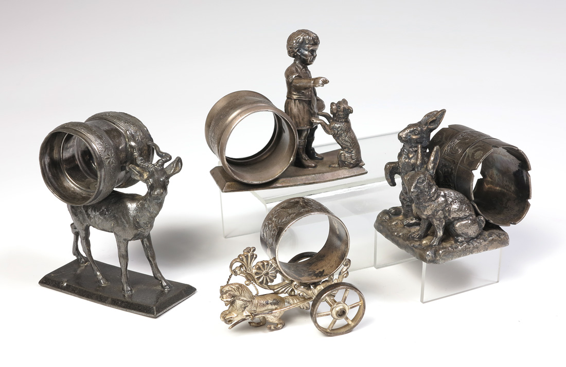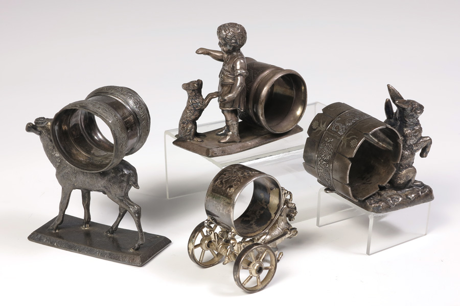 4 FIGURAL ANIMAL SILVERPLATE NAPKIN RINGS: 4 total pieces to include 1) Meriden antelope, ring on back, #204. 4'' h. 2) Pairpoint 2 rabbits, ring as log on back, ring is out of round, #683, 2 3/4''. 3) Rogers horse pulling cart, ring on cart, #213, 2 1/2'' h. 4) Rogers little girl with begging dog, ring on back, #199, 3 1/4'' h.