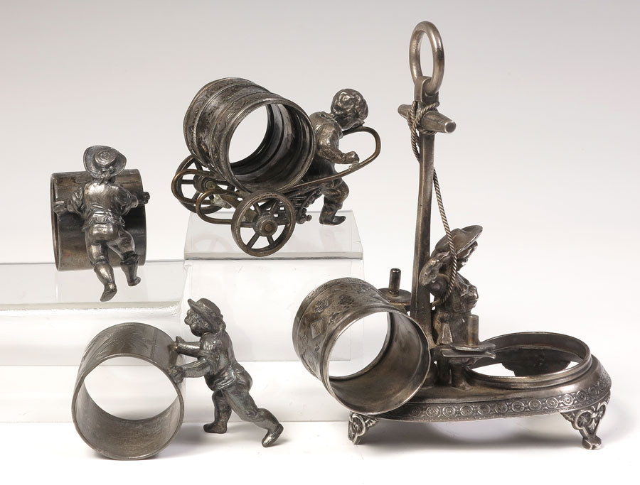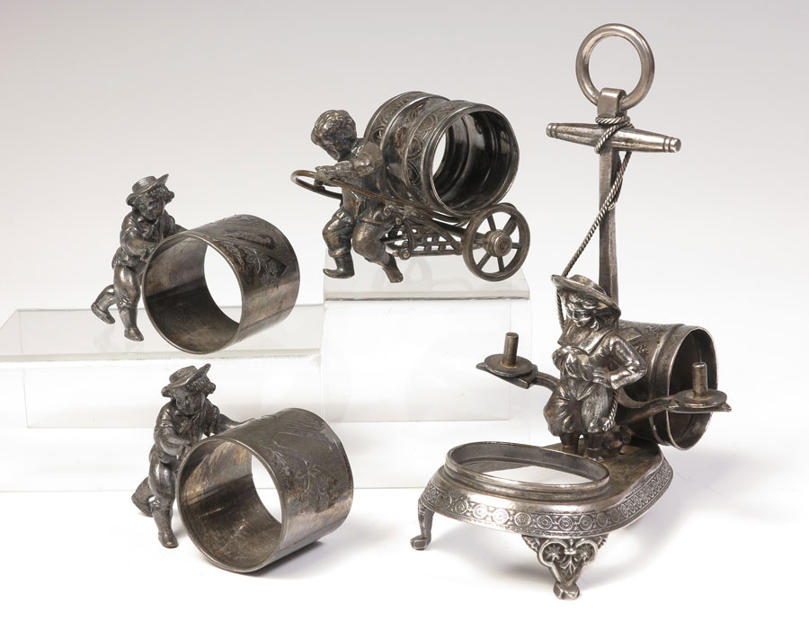 4 FIGURAL CHILDREN SILVERPLATE NAPKIN RINGS: 4 total pieces to include 1) Meriden child with anchor, ring on back condiment holder opening on front, no insert. #132, 7'' h. x 5 1/4''. 2) Boy pulling cart, ring on cart, no makers name, engraved ''Florence'' on ring, 2 3/4'' h. Note wambly. 3) Meriden 2 piece children pushing ring, one engraved ''Nellie'', 2 1/2'' h.