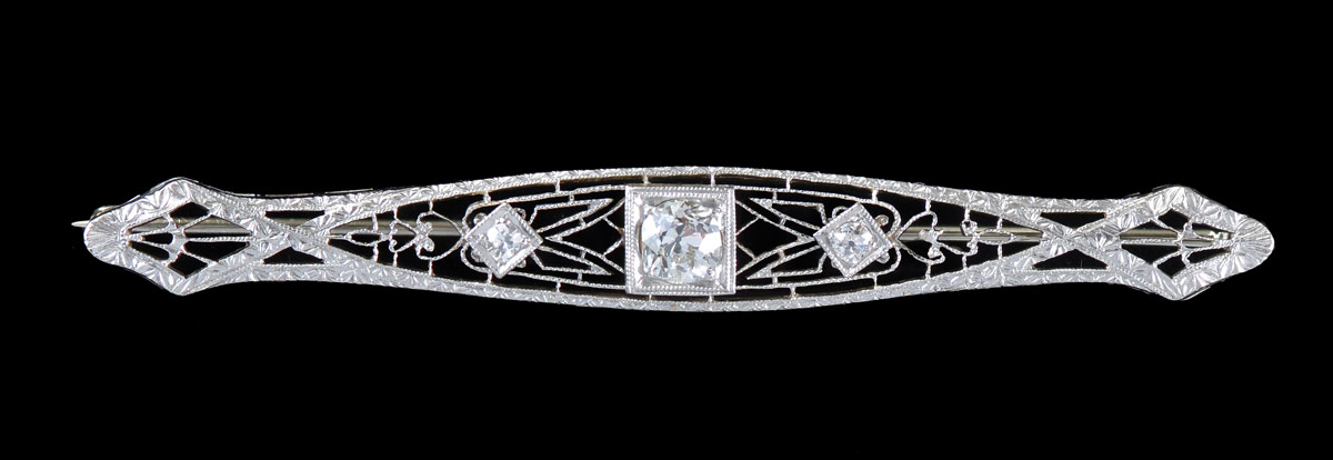 14K FILIGREE DIAMOND PIN: 14K white gold filigree pin contains 3 round full cut diamonds totaling approx. .50 Ct. Rated VS in clarity and H-I in color. The diamonds are prong set. Bar pin closure. Weight: 3.9 grams. Length; 2.5''.