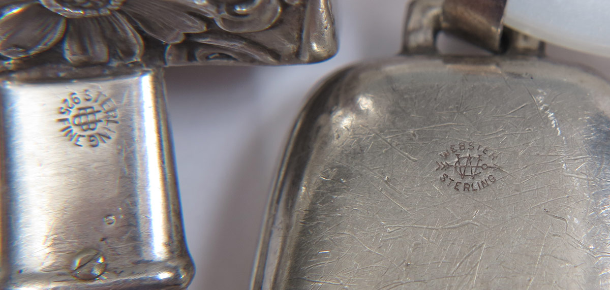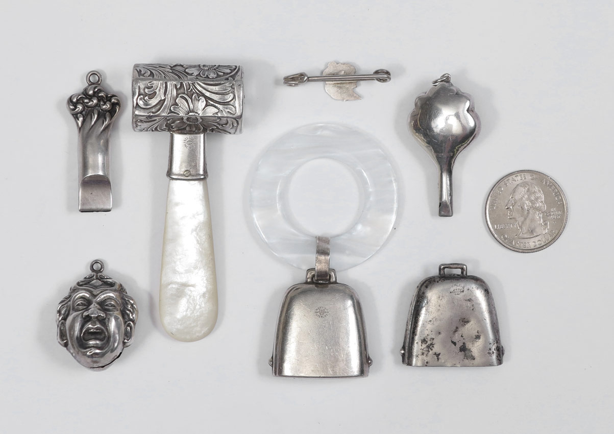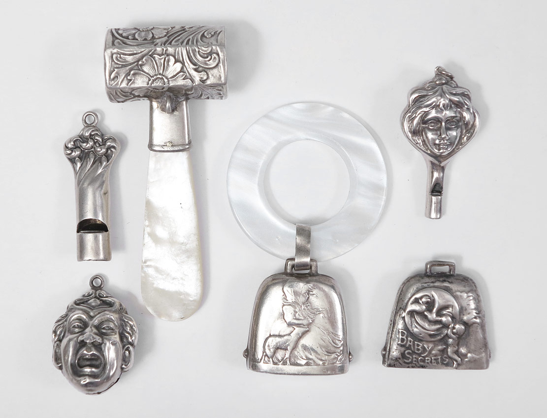 7 ART NOUVEAU STERLING CHILD'S RATTLES & MORE: 7 pieces total to include 1) Unger Brothers hammer type with mother of pearl handle, 3 1/8'' l. 2) Webster mother of pearl teething ring with rattle featuring child and dog. 3) Clown face rattle dangler. 4) Webster child and moon rattle dangler, missing clanger. 5) Woman's head whistle. 6) Unger Brother foliate top whistle. 7) Diaper safety pin with woman's bust.