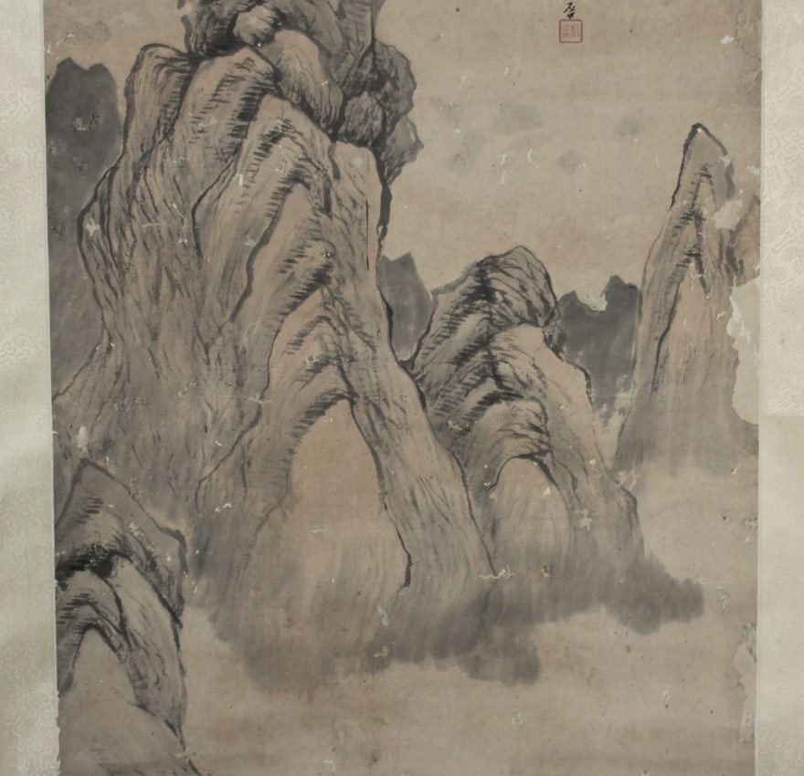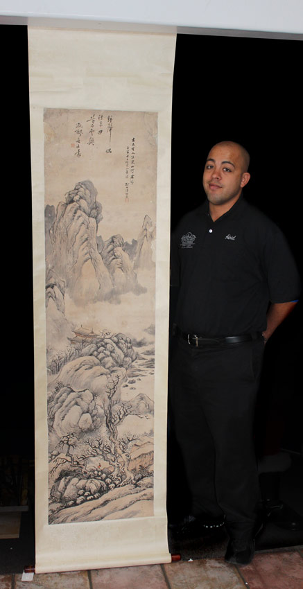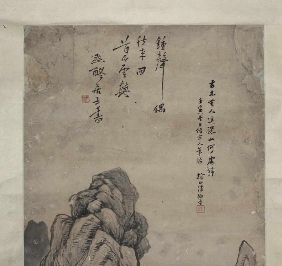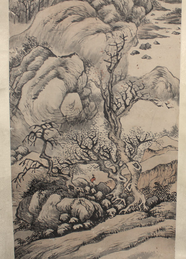 LARGE 19TH CENTURY ORIENTAL SCROLL: Landscape with Temple and Figure, Watercolor on Paper, laid down on silk backing, later Qing, 65'' x 17 1/2'' x 22'', with silk backing, has a weighted base and rolls in scroll form.