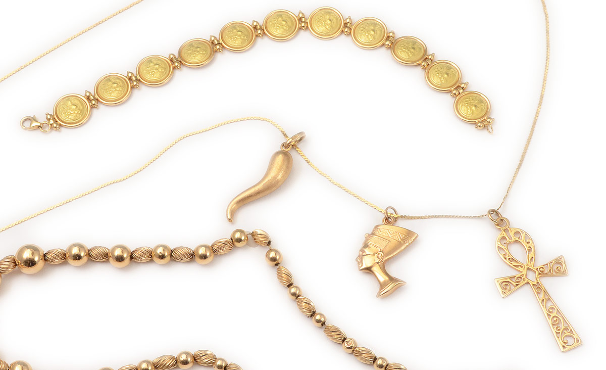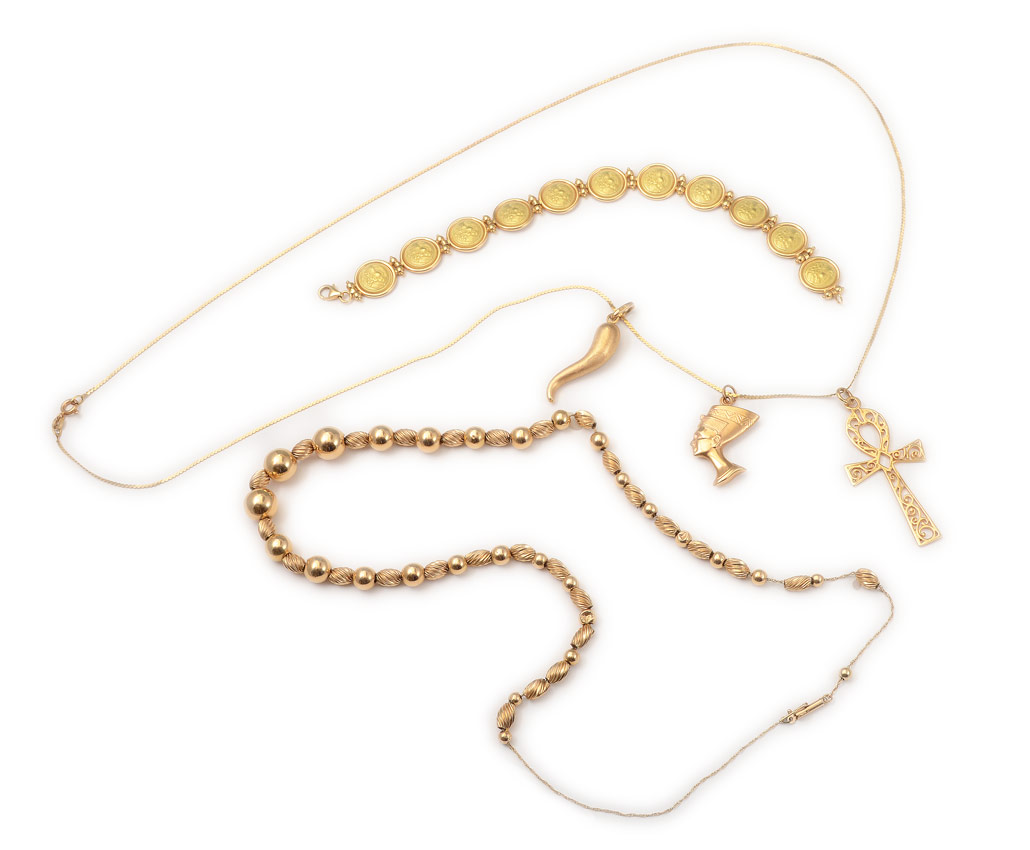 COLLECTION OF 18K & 14K GOLD JEWELRY: To include 1) Italian 18k yellow gold bracelet with 11 medallions featuring maidens bust in profile. 7 1/4'' l. 2) 14k yellow gold necklace with gold beads. 21'' l. 3) 14k Italian yellow gold necklace with 3 14k pendants including anch, bust of Cleopatra, horn. 27'' l. Approx. 18.7 grams 14k, 14 grams 18k.