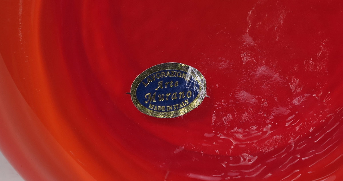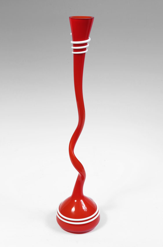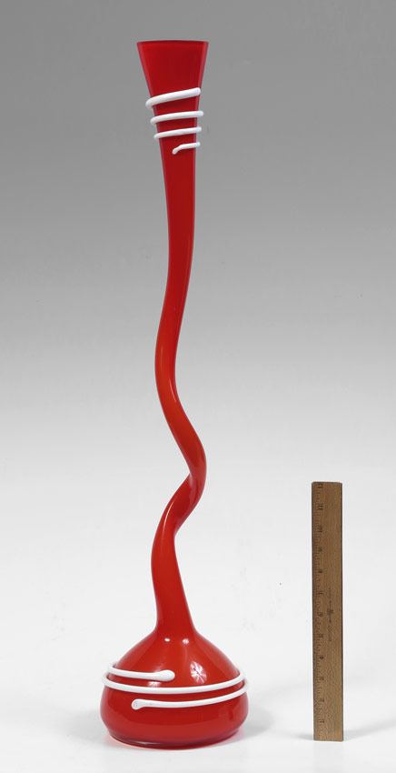 RED MURANO GLASS TALL VASE: Stretched abstract form neck with applied white glass on top and base. Original foil label. 32'' h. x 6 3/4''.