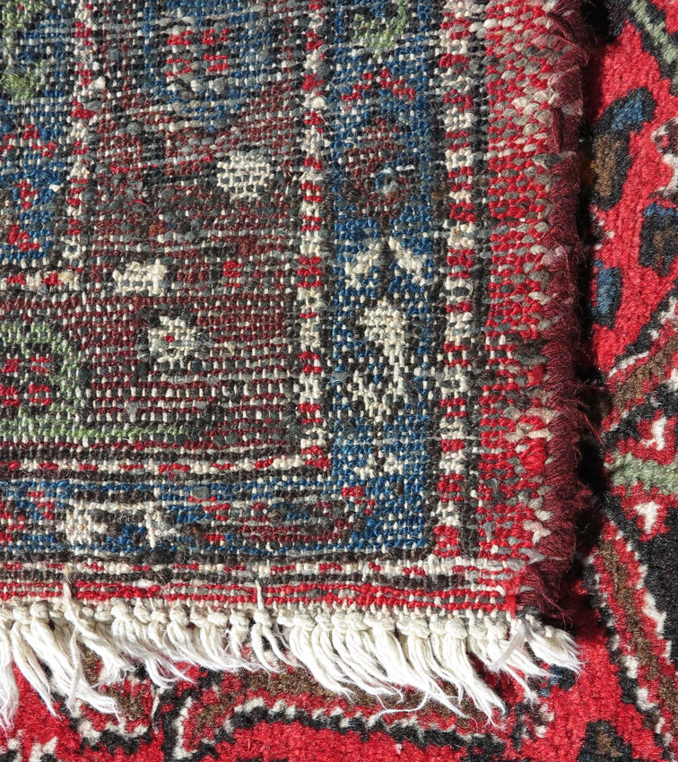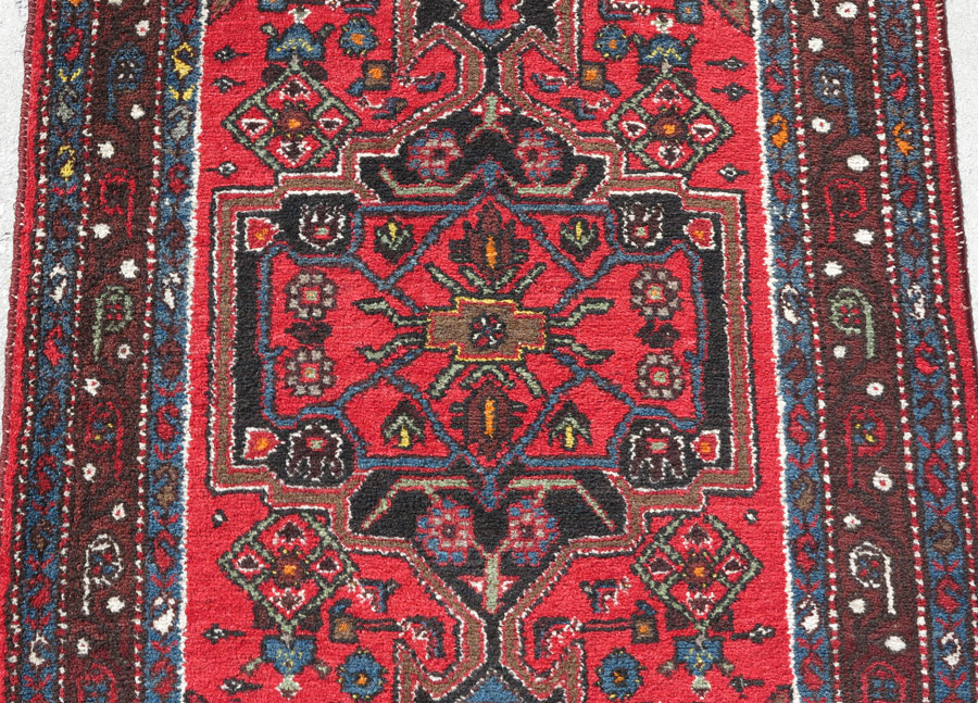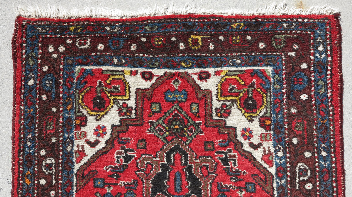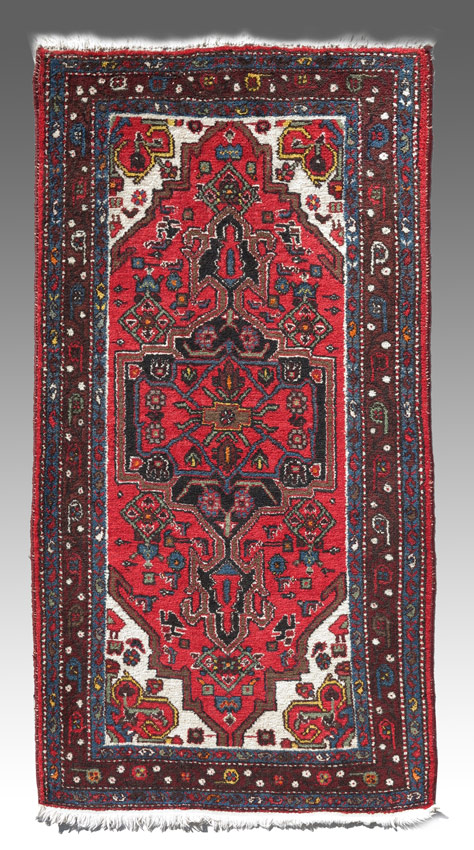 SEMI-ANTIQUE PERSIAN HAMADAN HAND KNOTTED WOOL RUG, 3'4'' x 6': This rug has a bold central medallion outlined in black and white, red and beige on a cherry red field. The three borders consist of two smaller blue grounds on either side of a brown ground main border. Although this is not a fine weave, this is a happy looking rug that will be very durable. Condition is good.