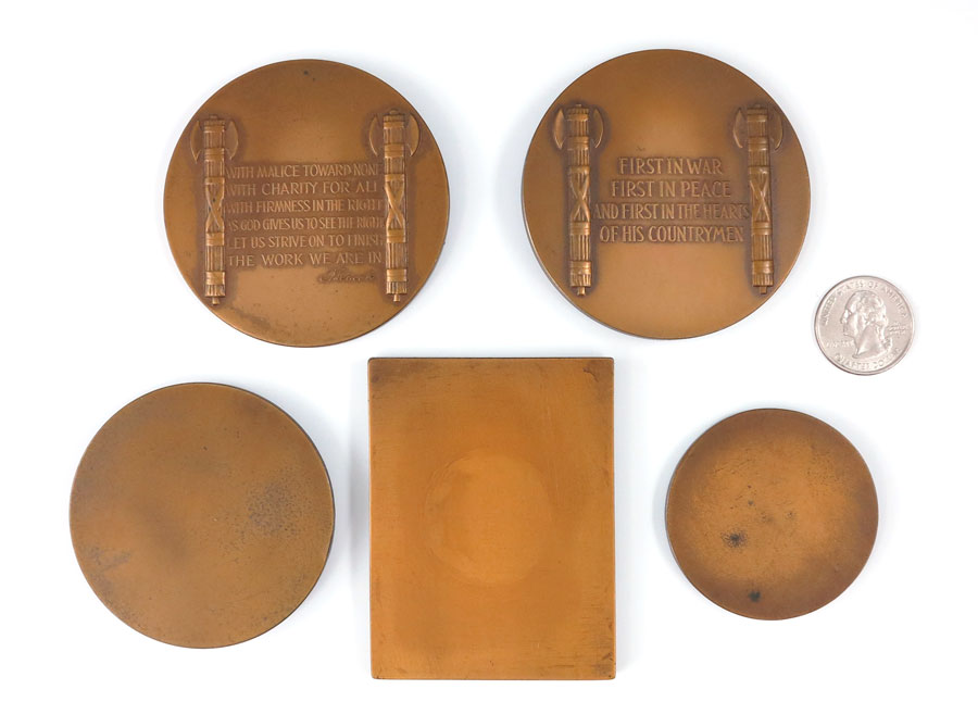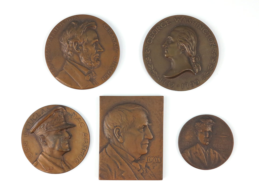 5 MEDALLIC ART CO. COMMEMORATIVE BRONZE MEDALLIONS: All 5 marked Medallic Arts Co. to include 1) Charles Lindbergh. 2) George Washington 2 3/4''. 3) Abraham Lincoln. 4) Gen. Douglas Mac Arthur. 5) Edison plaque, 3'' x 2 1/4''.