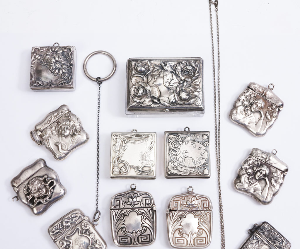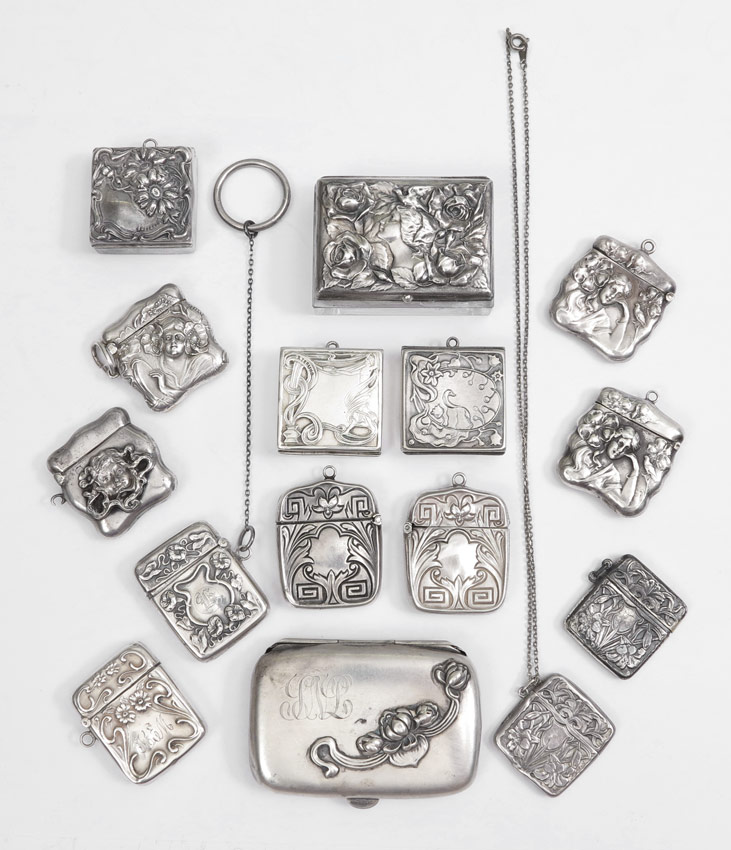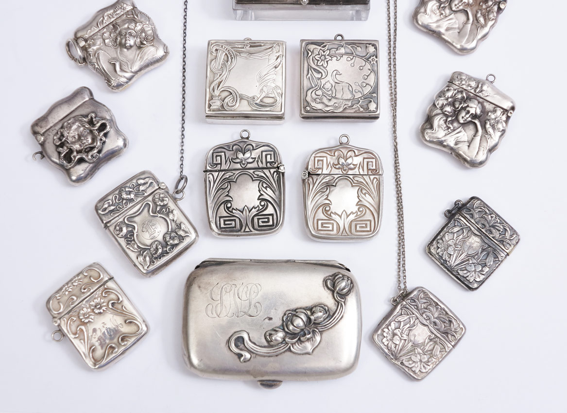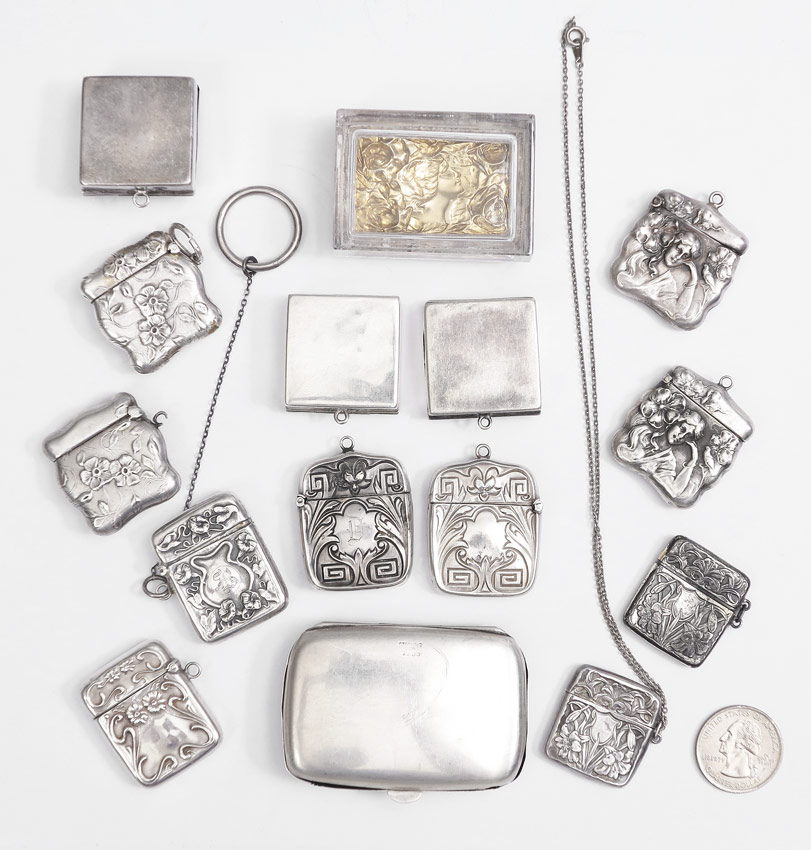 COLLECTION OF ART NOUVEAU STERLING STAMP CASES: 15 total pieces to include 1) 10 cases for chatelaine, one marked Unger Brothers, 2 marked Webster. Some monogrammed. 2) 3 square cases, 2 are marked Webster, on marked Sterling-A. 4) Case with applied floral motif, monogrammed, lid does not sit correctly. 2 1/2'' x 1 3/4''. 5) Foster & Bailey hinged top with glass base. Approx. 4.3 troy oz.