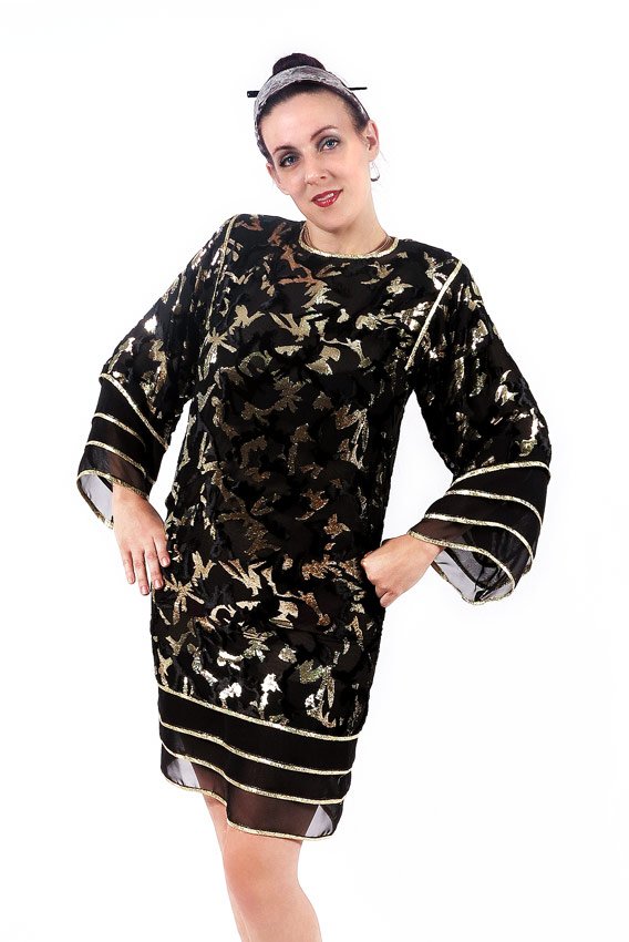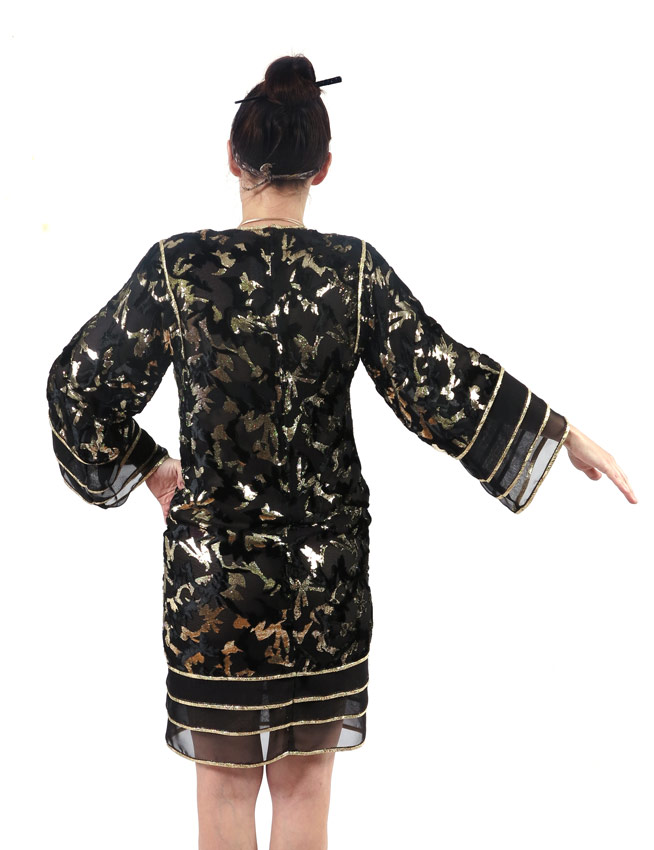 DESIGNER BLACK & GOLD DRESS: Sheer burnout black velvet dress with gold and silver Lurex organic design. Sleeves and bottom of dress have a unique 4 layer overlapping hem. Shoulder pads, zipper back. Approx. size 6. 3' from neckline to bottom, 16'' from pit to cuff, 15'' from shoulder to shoulder. Machine stitched. Sold with sheer single layer jacket with Lurex trim.