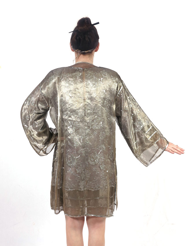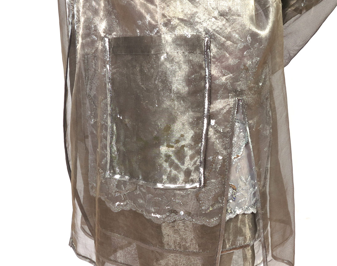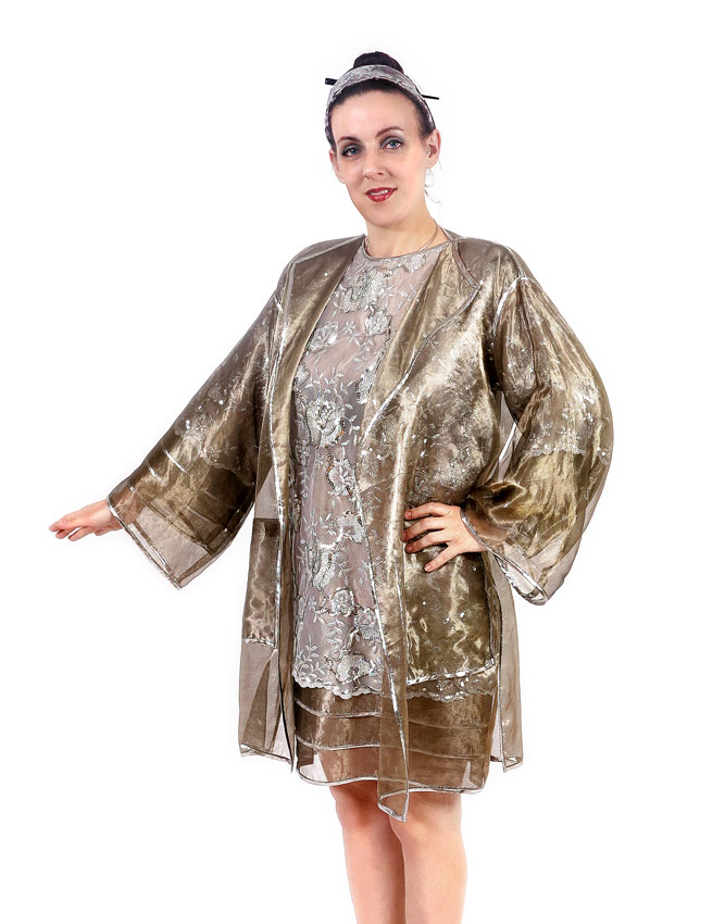 DESIGNER SILVER SEQUIN DRESS WITH JACKET: Silver netting over silver see through fabric, floral organic design with silver Lurex and sequin accents. 4 layer overlapping sleeve endings and bottom of dress. Metal and rhinestone button clasp. Approx. size 6, 36'' neck to bottom, 15'' pit to cuff, 19'' shoulder to shoulder. Single layer sheer jacket with pockets, Lurex trim.
