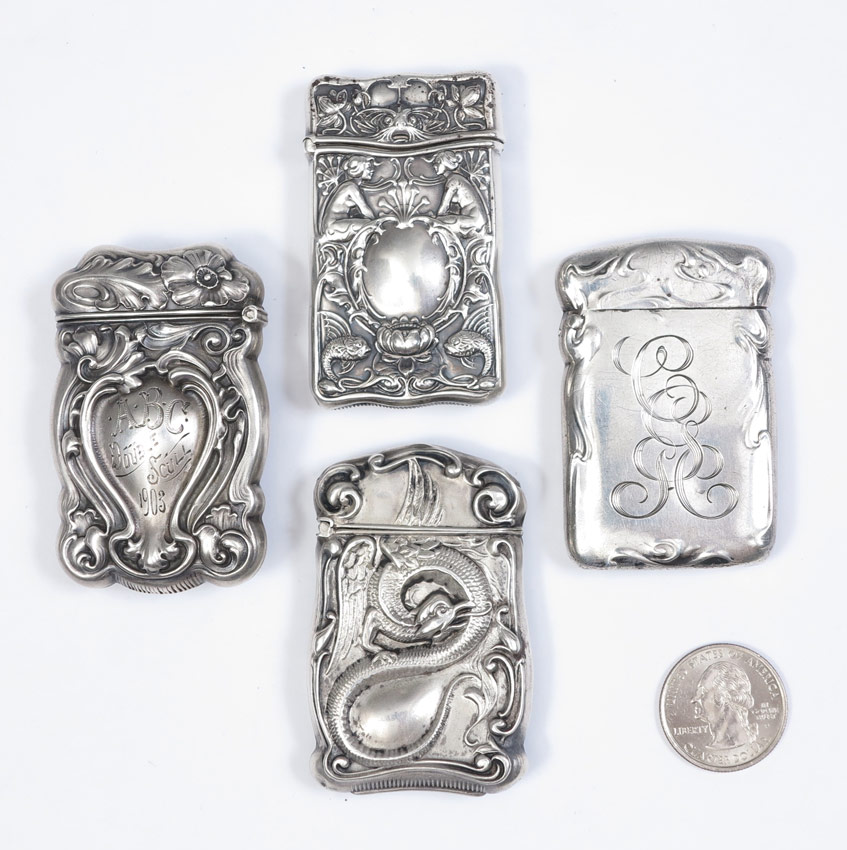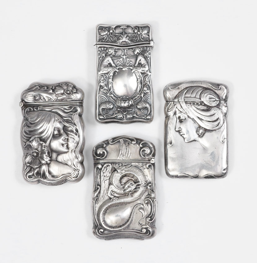 4 ART NOUVEAU STERLING MATCH SAFES: 4 pieces to include 1) Gorham 2 nude women sitting above 2 fish. 2) Blackington maiden looking down. 3) Illegible woman with flower in hair, engraved ABC Double Scull 1903. 4) Sterling G winged dragon. Approx. 3.5 troy oz.