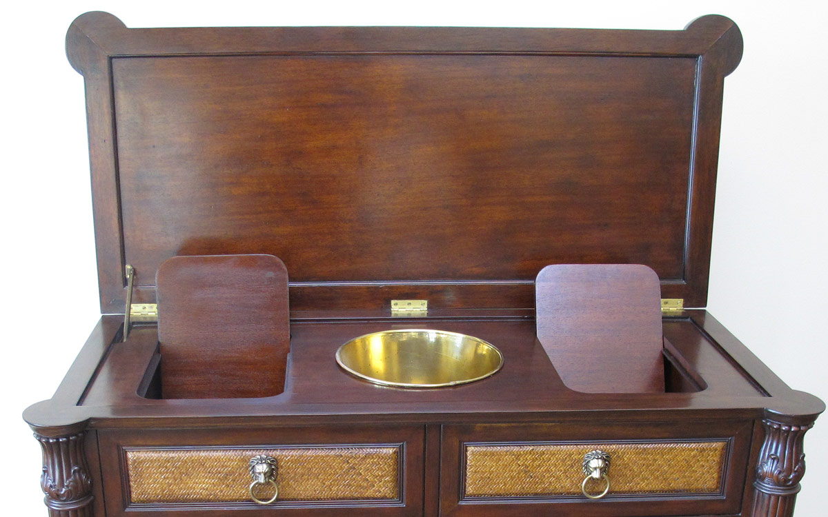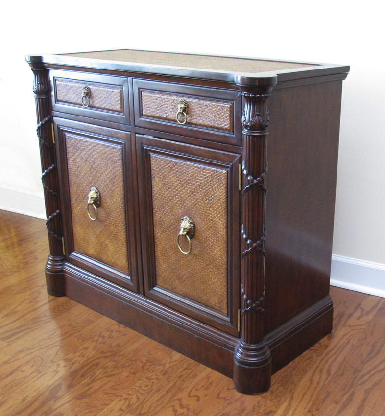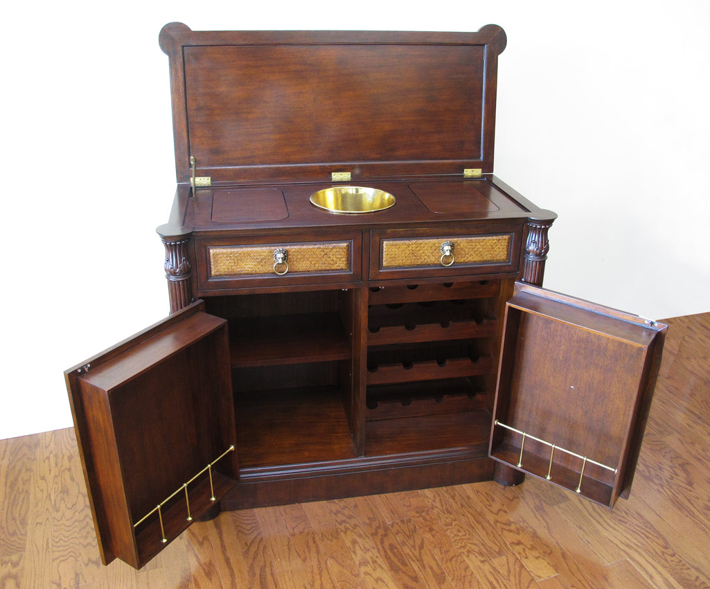 CARVED CONTEMPORARY BAR: Inset woven grass lift top with cookie corners. Ice bucket and removable panels for storage. Woven grass decoration continues to false drawer and 2 door fronts, carved 3/4 column sides. Doors open to reveal in door storage, wine racks and shelf. 38 1/2'' h. x 44 3/4'' x 20''.