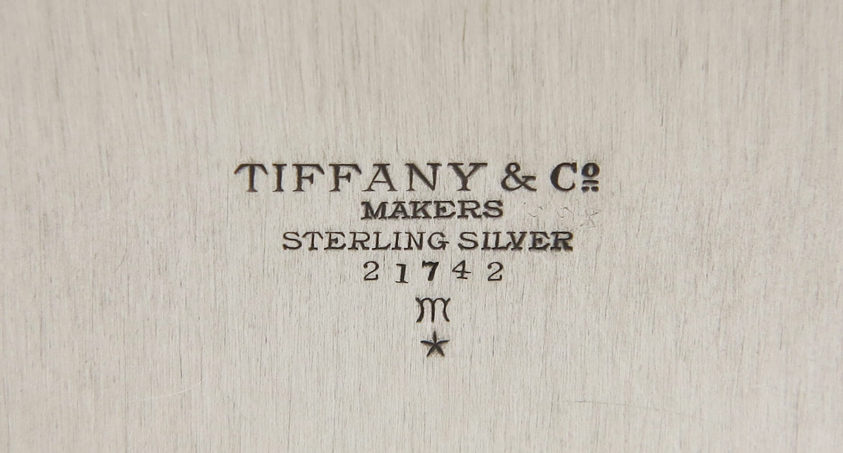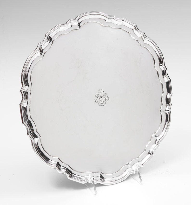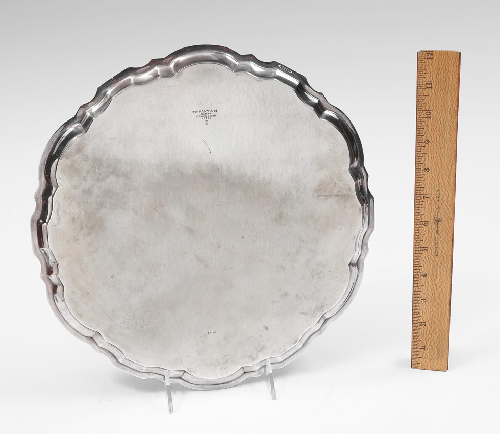 TIFFANY STERLING SERVING TRAY: Marked Tiffany & Co. Makers, Sterling Silver, 21742. 12 1/4'' dia. Monogrammed SRS. With Tiffany storage bag. Approx. 31.4 troy oz.