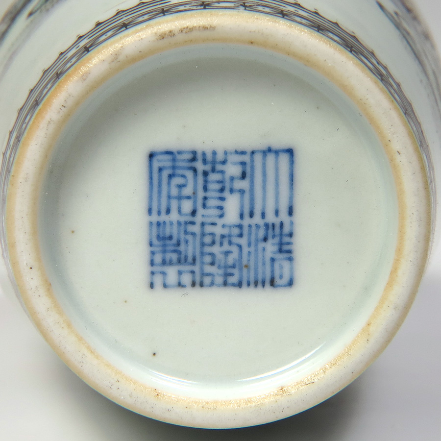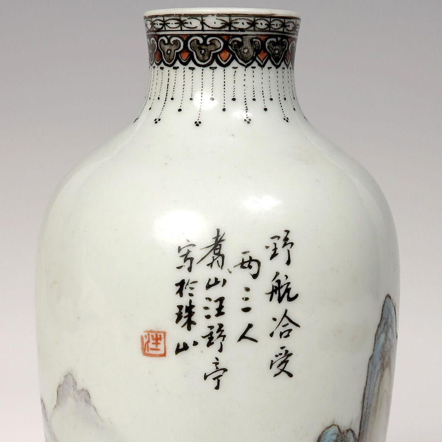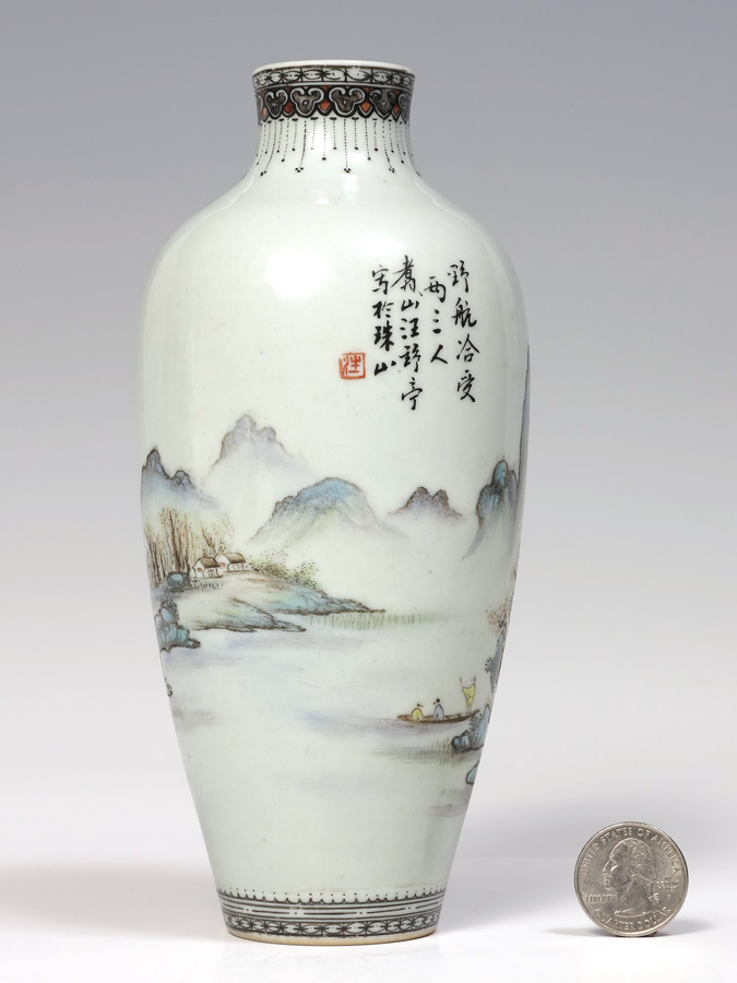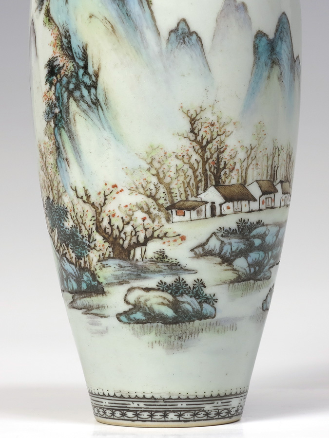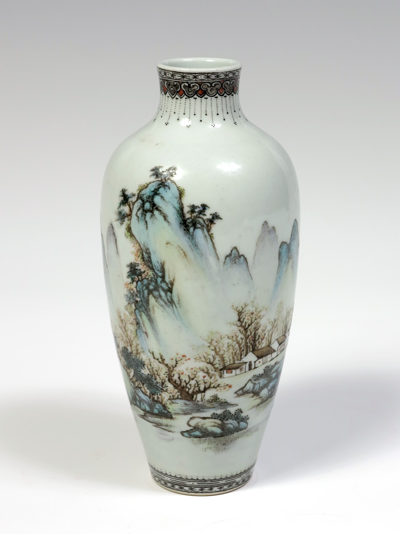 CHINESE FINE PORCELAIN HAND PAINTED VASE: Mountain view scenic landscape, 7 1/4'' tall. blue character marks. Actual age unknown.