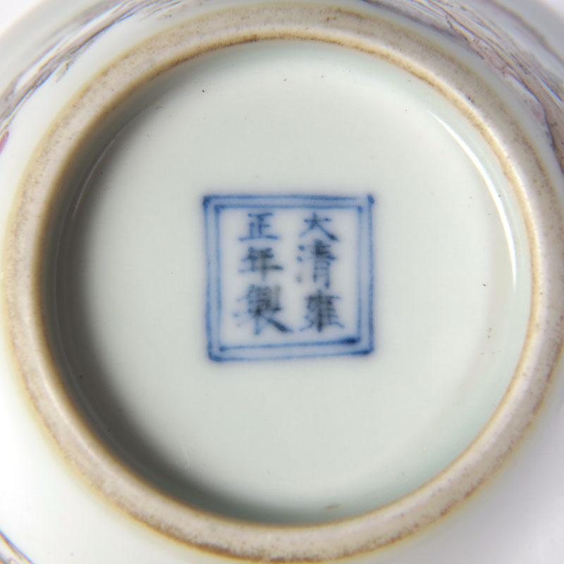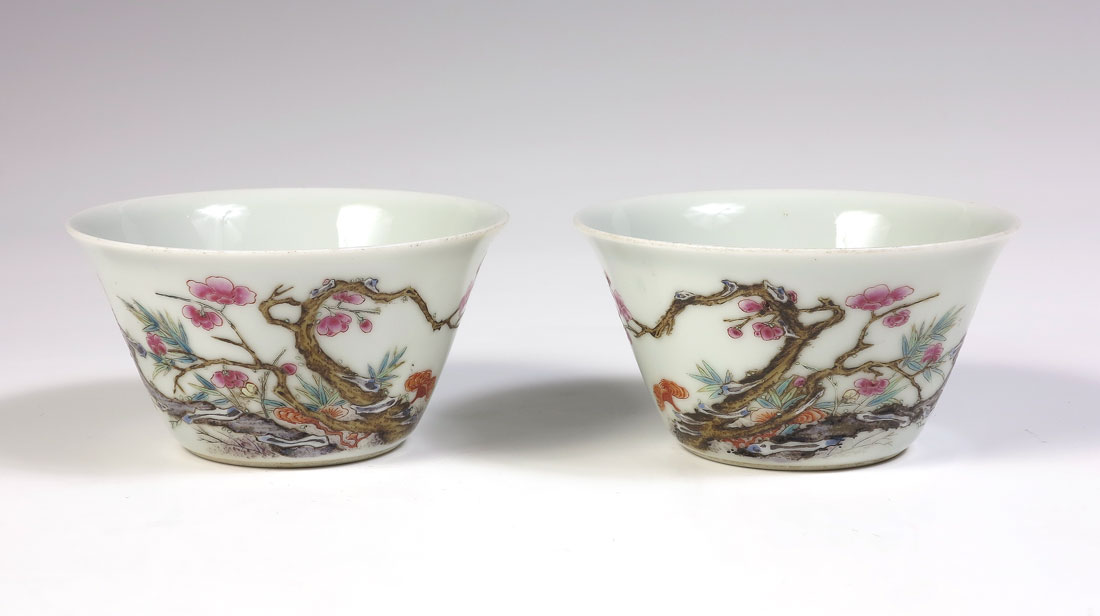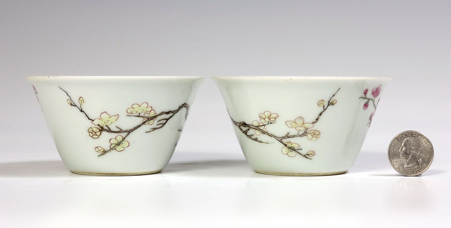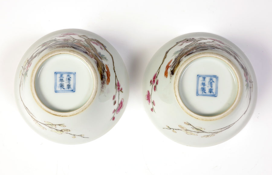 PAIR CHINESE FINE PORCELAIN TEA BOWLS: Blue mark underglaze. 2'' tall x 4'' dia. Actual age unknown.