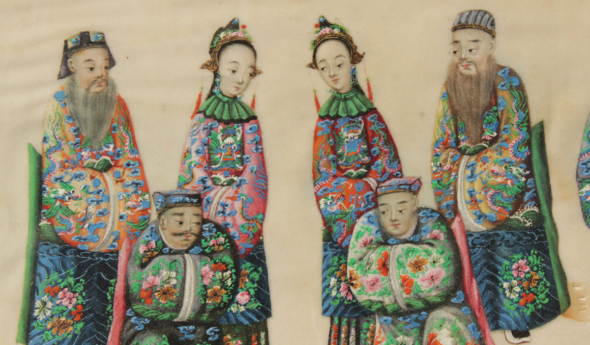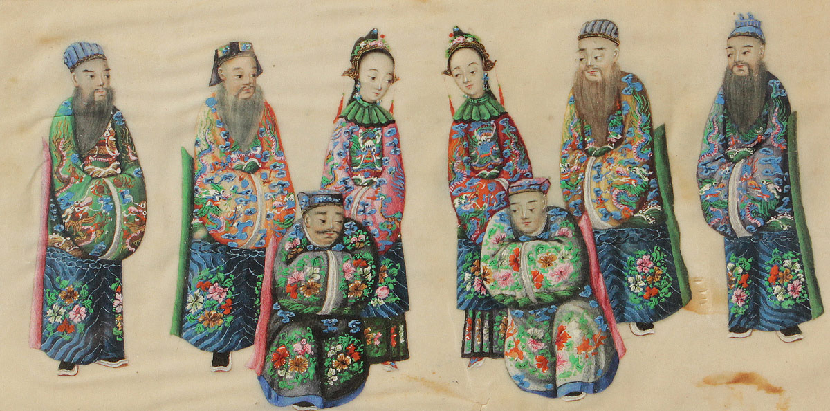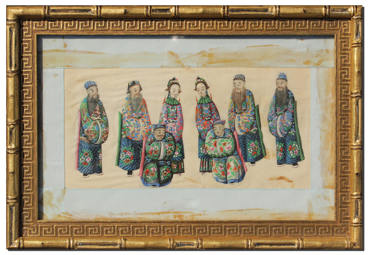 INTERESTING AND UNUSUAL ORIENTAL MINIATURE PAINTING: Watercolor/Silk?, Sight size 4 1/4'' x 8 3/4'', Depicting Eight Figures Elaborately Dressed in Dragon and Flora Motif Kimonos, encased in faux bamboo frame with wear 8 1/2'' x 13'', no visible signature, not examined out of the frame.
