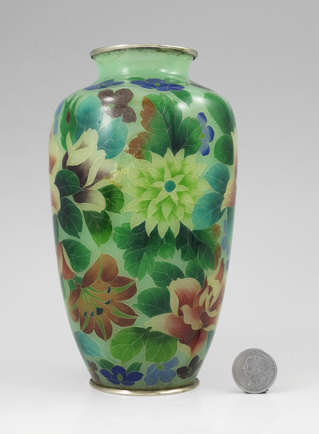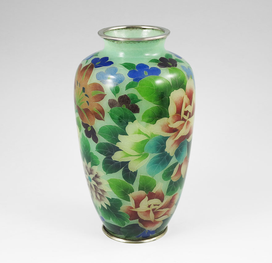 JAPANESE PLIQUE A JOUR CLOISONNE VASE: All over floral decor on light green ground, 9'' tall. Marked Made in Japan.