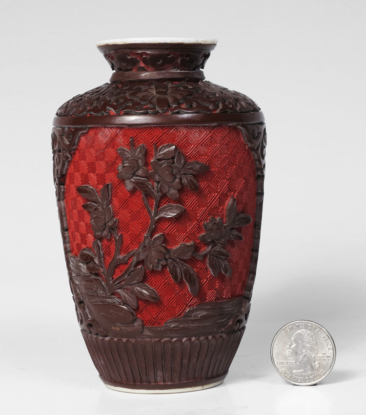 CARVED LACQUER CINNABAR ON PORCELAIN VASE: 5'' tall