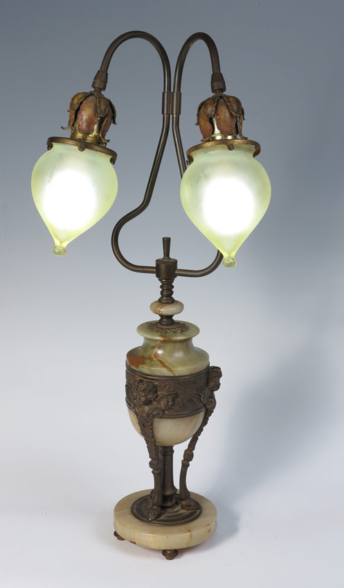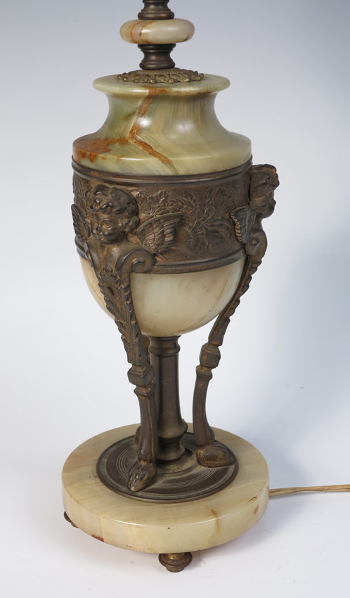 1920'S ONYX LAMP WITH VASELINE GLASS SHADES: Green onyx body and base with figural cast metal stand featuring cherubs and hoofed feet. Shaped harp with floral ends, vaseline glass shades. Overall 27'' h. x 10 1/2'', shades 5'' h. x 4''.