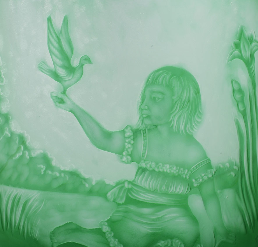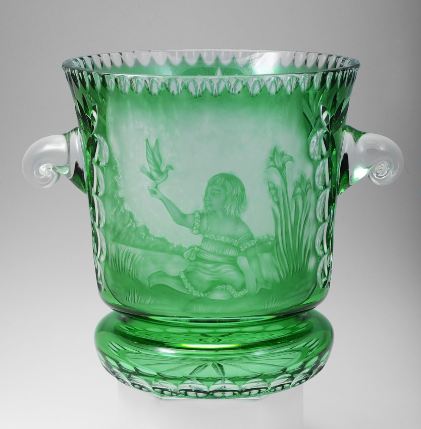 BOHEMIAN GREEN CUT TO CLEAR CHAMPAGNE BUCKET: Signed M. Chajec. 1/50. Cameo carved image of a young girl with bird. 9 3/4'' tall x 9'' dia., excluding the scroll handles.