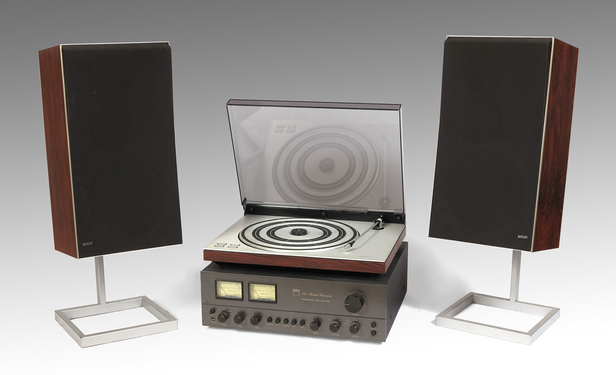 BANG & OLUFSEN TURNTABLE, SPEAKERS AND NAD AMPLIFIER: To include 1) Bang & Olufsen Beogram 1700 turntable with original box, manuals, etc. 3 3/8'' h. x 17 1/2'' x 13''. 2) Pair Bang & Olufsen Beovox S45-2 speakers with metal stands. 27 1/2'' h. x 10'' x 8 1/4''. 3) NAD (New Acoustic Dimensions) Stereophonic 3045 amplifier. 5 1/2'' h. x 17 3/4'' x 14 1/2''.