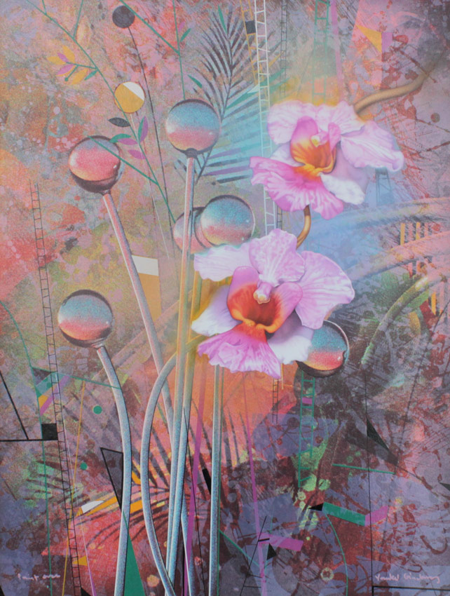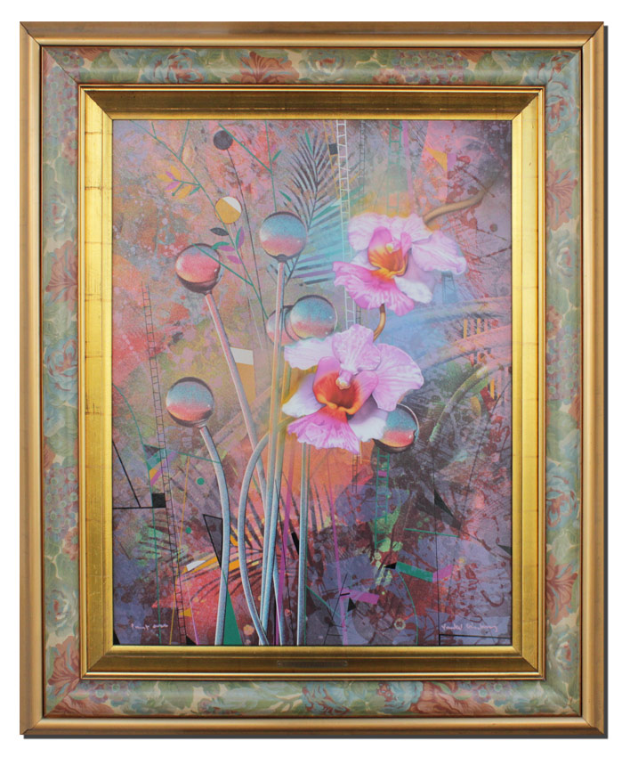 YANKEL GINZBURG MIXED MEDIA ORCHIDS PAINT OVER: Sight size 28 1/2'' x 22 1/4'', signed lower right, custom frame, 40 1/2'' x 34 1/4''.