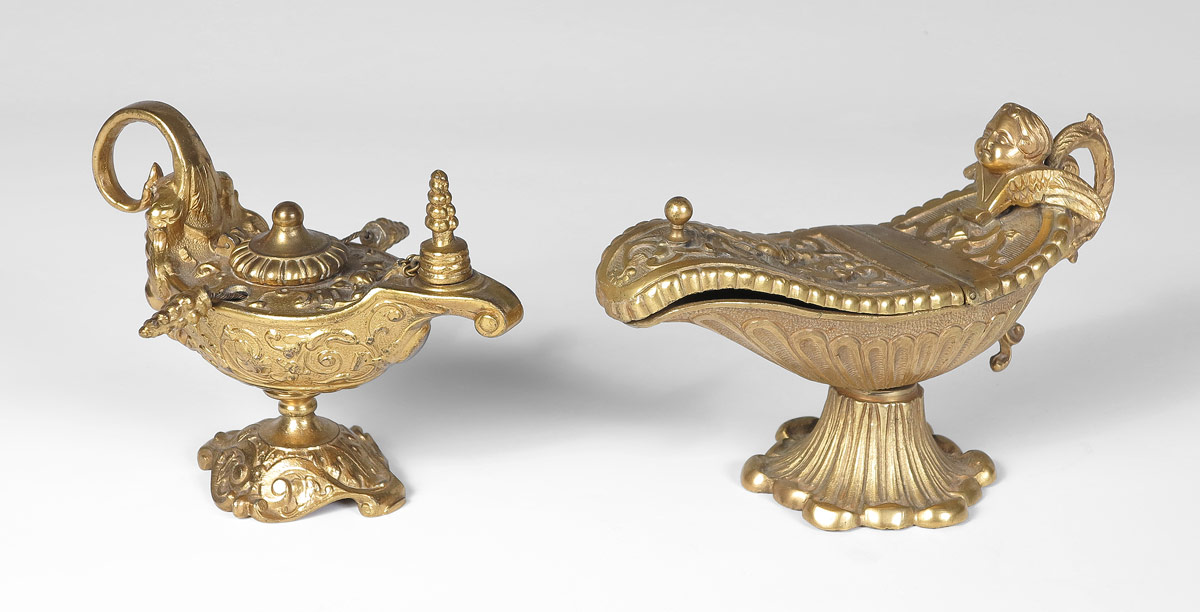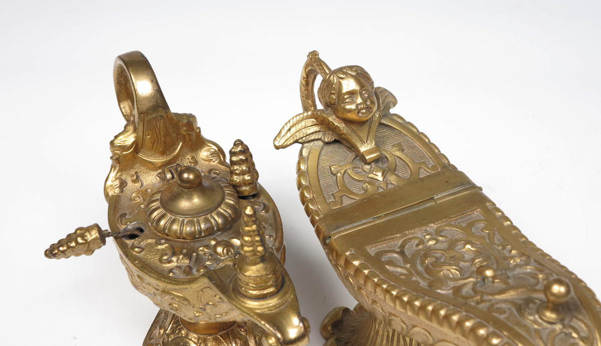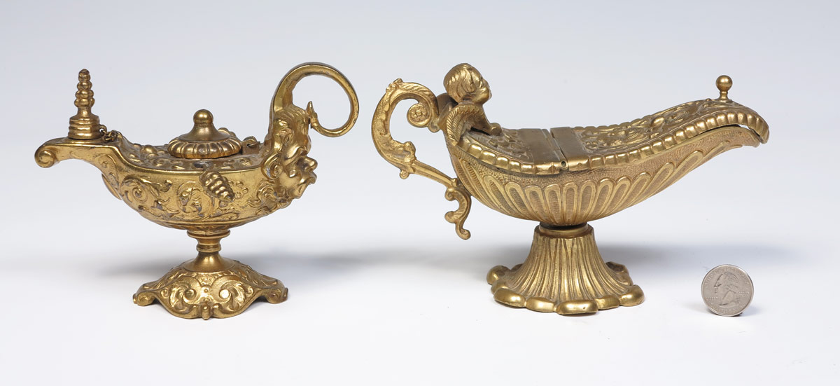 FIGURAL BRONZE ALADDIN LAMP & OIL RESERVOIR: 2 pieces to include 1) Aladdin style oil lamp with figural masqueron under handle. 4 1/2'' h. x 6'' x 2 1/2''. 2) Oil reservoir with figural putti at handle. 4 1/2'' h. x 7 1/2'' x 3''.