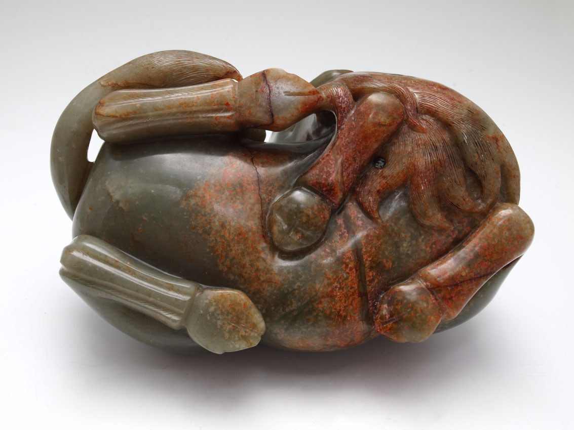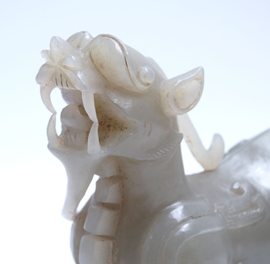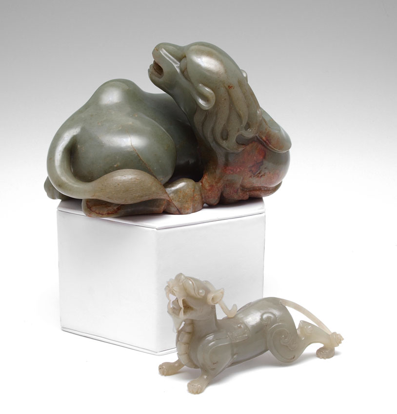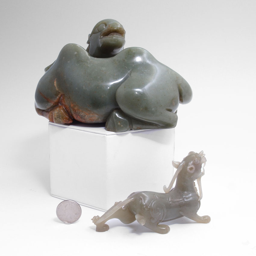 2 PIECE ASIAN CARVED STONE FIGURES: Carved hard stone figures to include 1) Camel, 4'' h. x 6 1/2'' x 4 3/4''. 2) Smaller mythical lion, 2 1/2'' x 4 1/2''