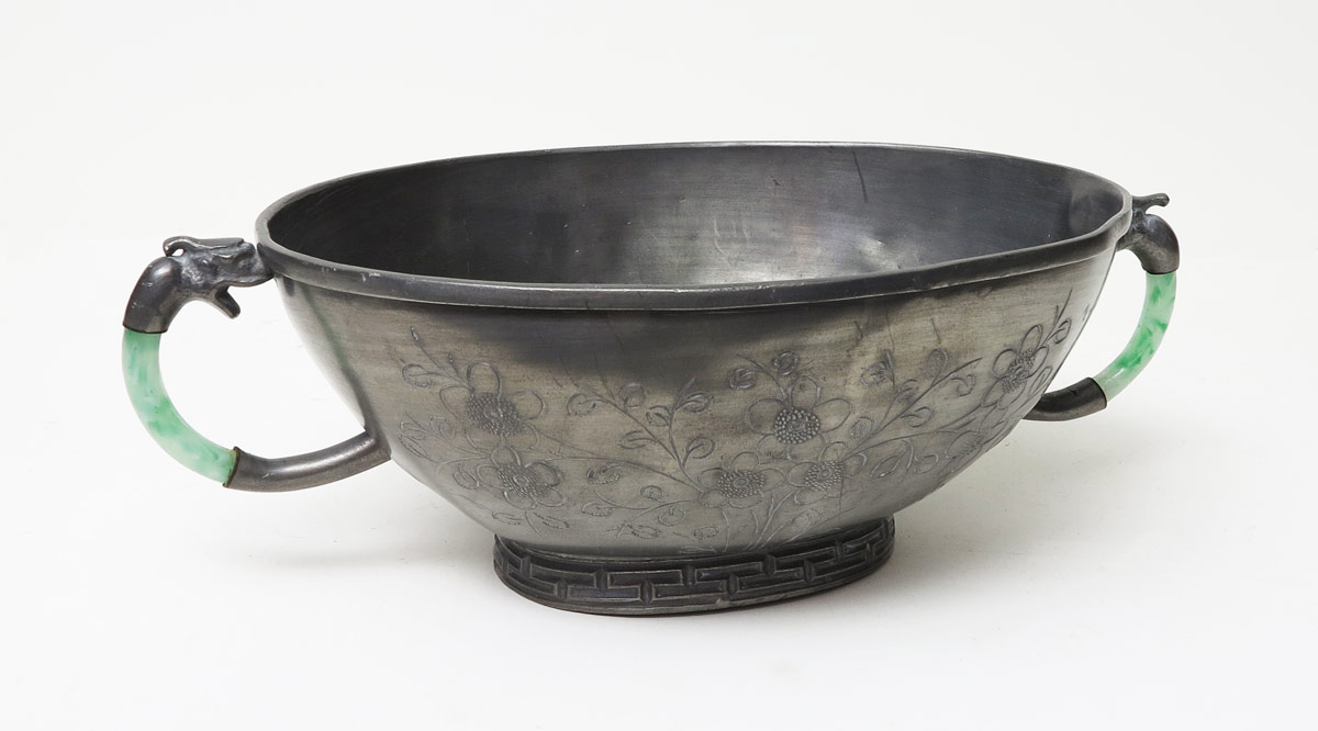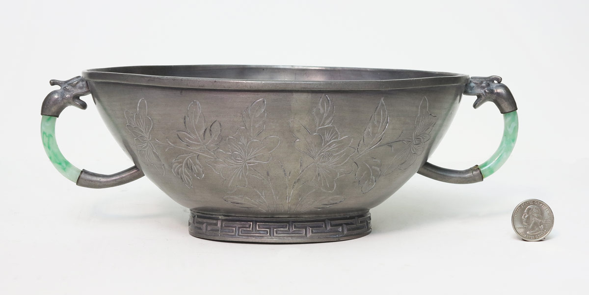CHINESE PEWTER BOWL WITH JADE HANDLES: Incised decoration, jade and figural foo dog handles, short pedestal. 3 3/4'' tall x 11 1/2'' dia. overall.
