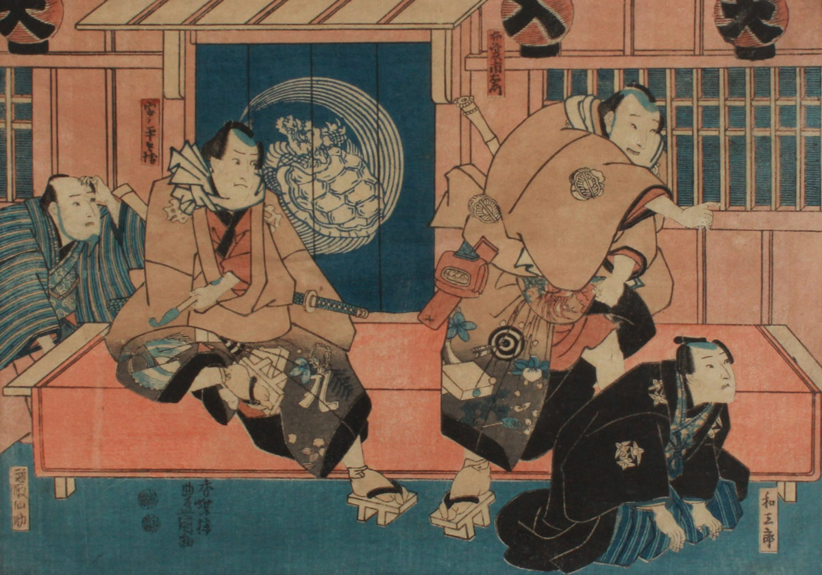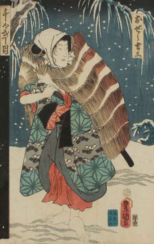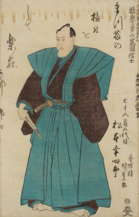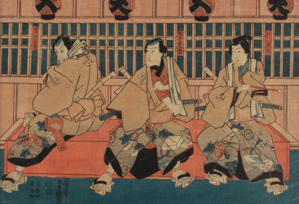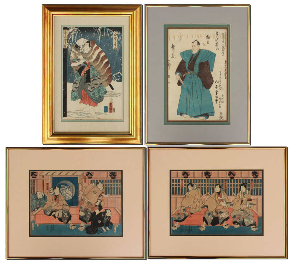 FOUR PIECE JAPANESE WOODBLOCK UKIYOE WOODBLOCK LOT: 1) Toyokuni III, Depicting a Female Traveler in Snowy Landscape, Sight size 13 3/4'' x 9'', contemporary frame 20 3/4'' x 15 1/2''. 2) Toyokuni III, Dojo Interior with Three Warriors, Sight size 9 1/4'' x 13 1/2'', contemporary frame 16 1/2'' x 21''. 3) Toyokuni III, Interior with Several Samurai and the Edge People, Sight size 9 1/2'' x 13 1/2 , contemporary frame 17'' x 21''. 4) Kuni Sada, Depicts an Older Samurai wearing Blue Robe, Sight size 13 1/2'' x 9'', contemporary frame 21'' x 16 1/2''.