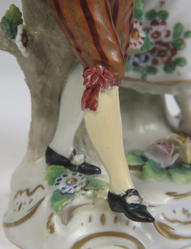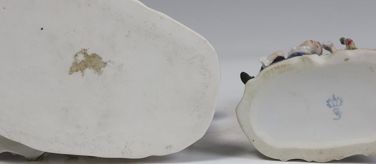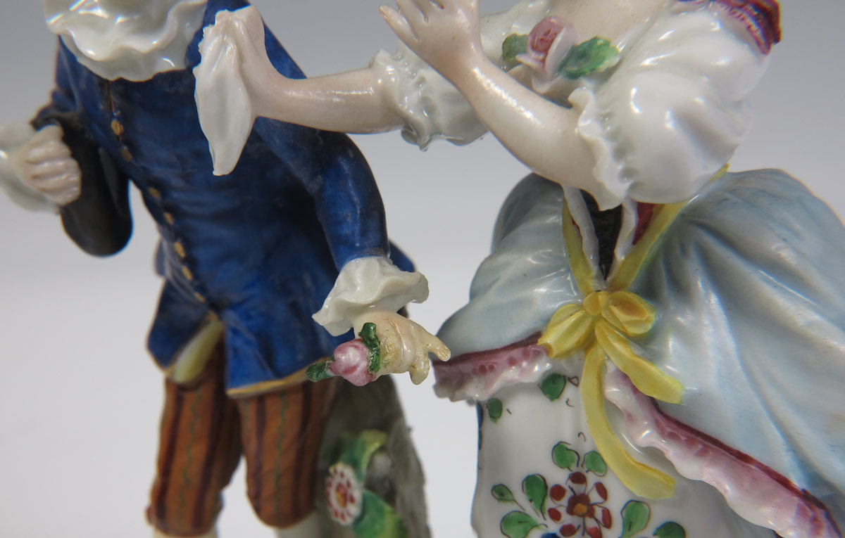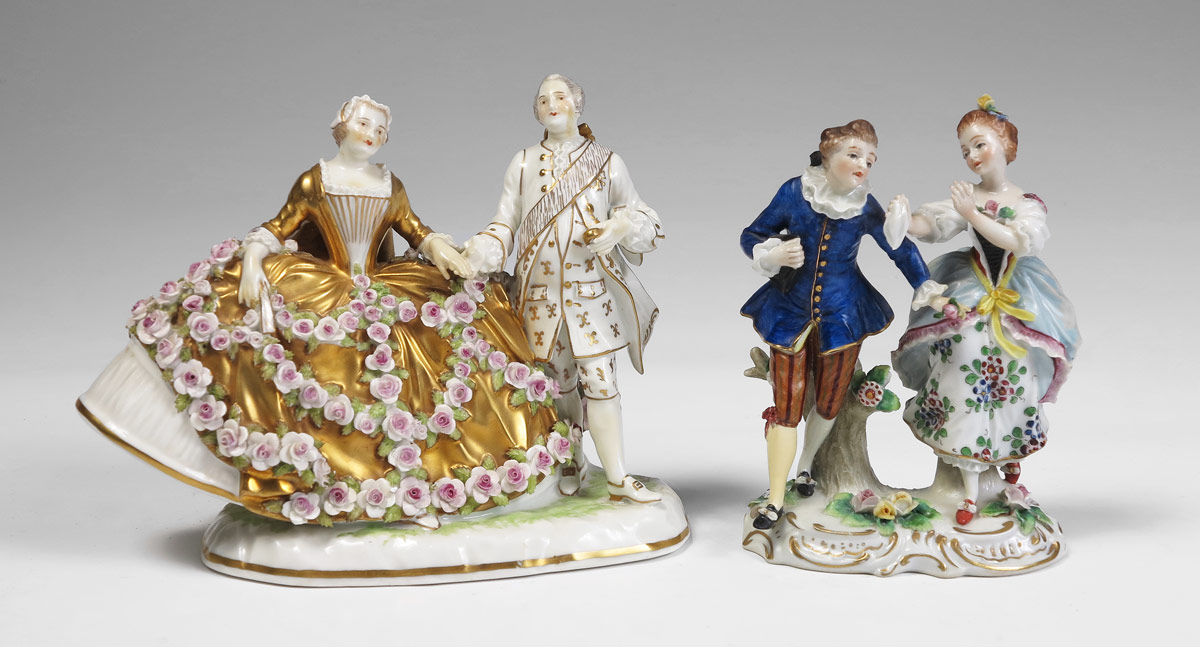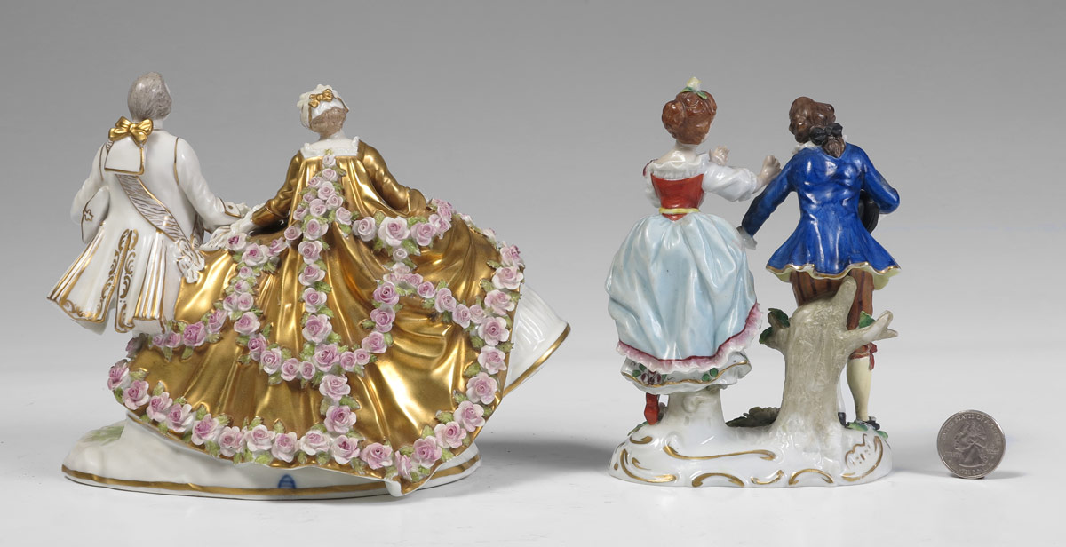 2 PIECE FINE PORCELAIN DOUBLE FIGURES: To include 1) Gilt decorated man and woman with applied flowers on dress of woman. Underglaze beehive mark. 5 3/4'' h. x 7 1/4''. 2) Sitzendorf man and woman, polychrome decoration and applied flowers on base. 5 1/2'' h. x 4'' x 2 1/4''.