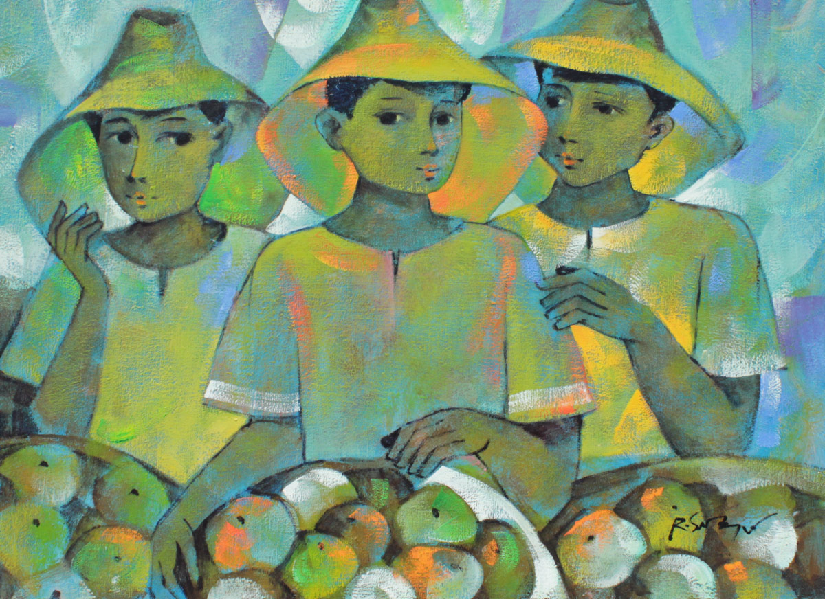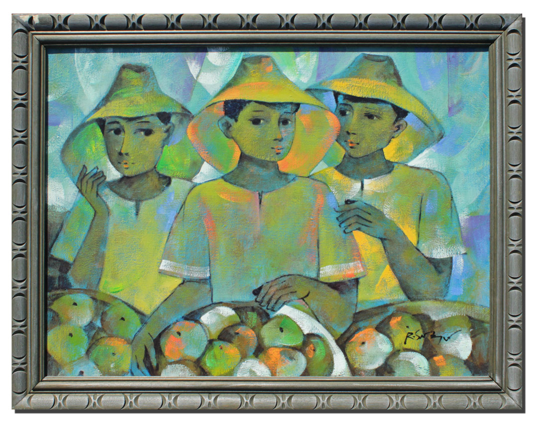 LATIN AMERICAN PAINTING THREE YOUNG APPLE SELLERS: Oil/Canvas, illegibly signed lower right, 18'' x 24'', framed 21 1/4'' x 27 1/4''.