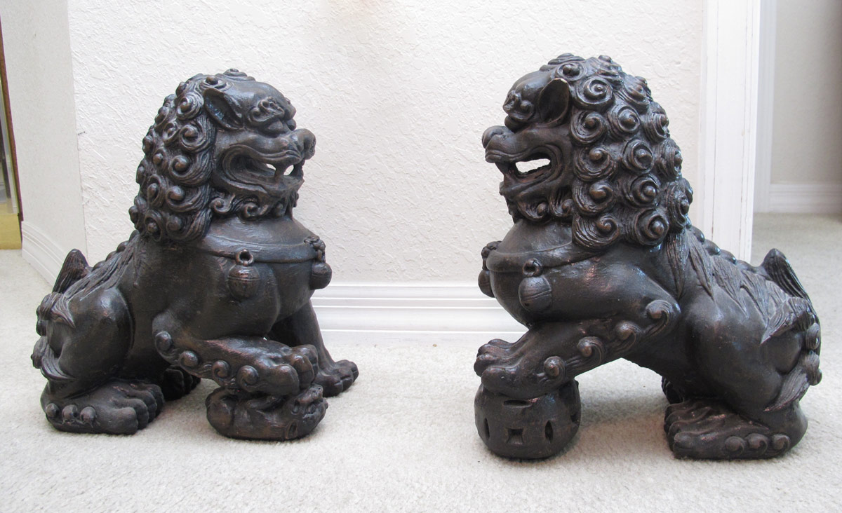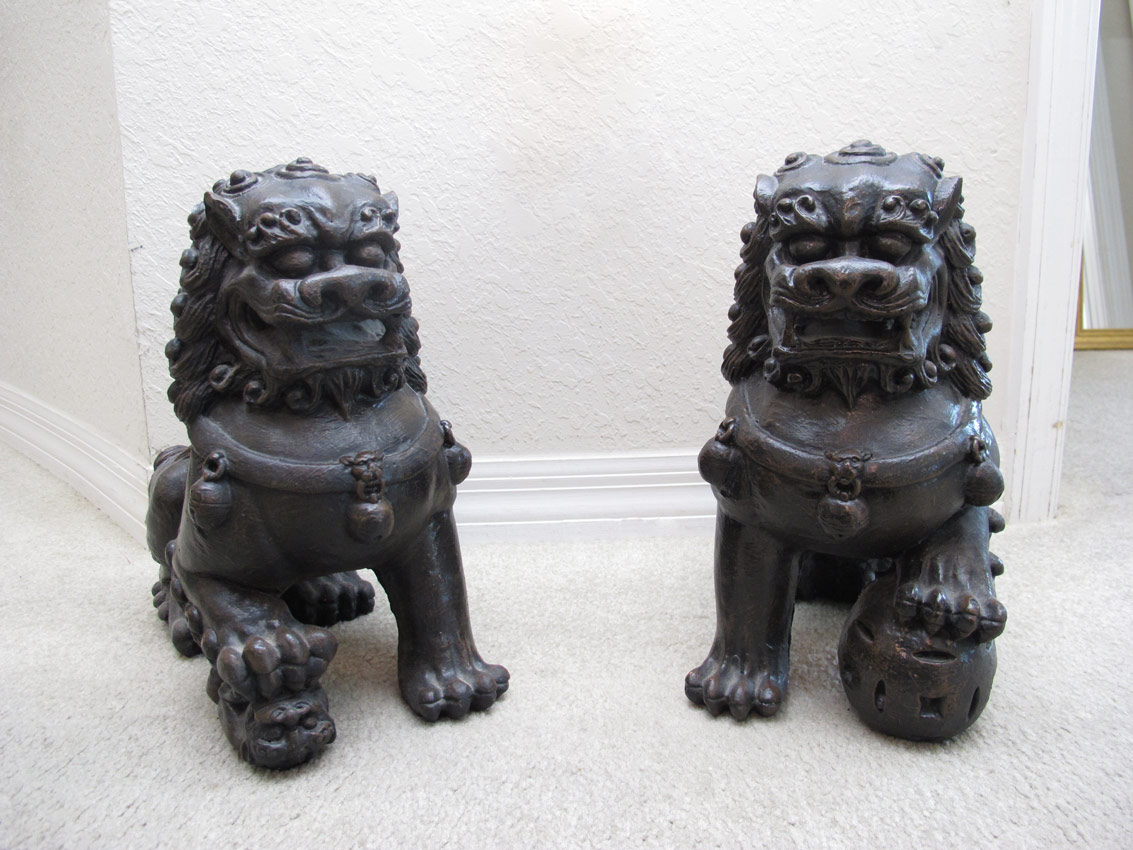 PAIR DECORATIVE FOO DOGS: Decorative foo dogs, resin composite construction. 13 1/2'' h. x 12'' x 7 1/2''.