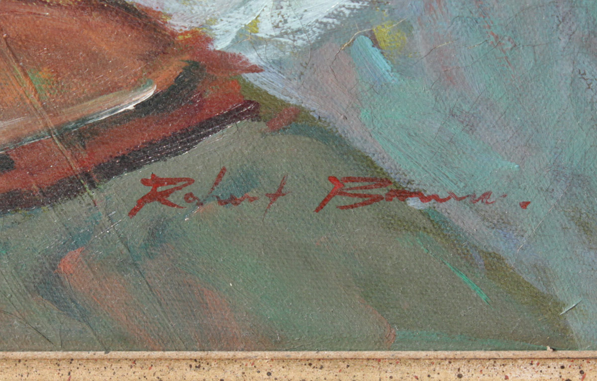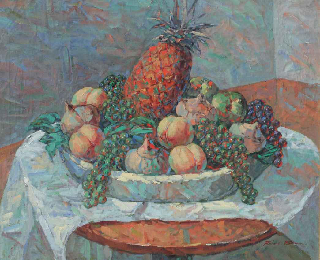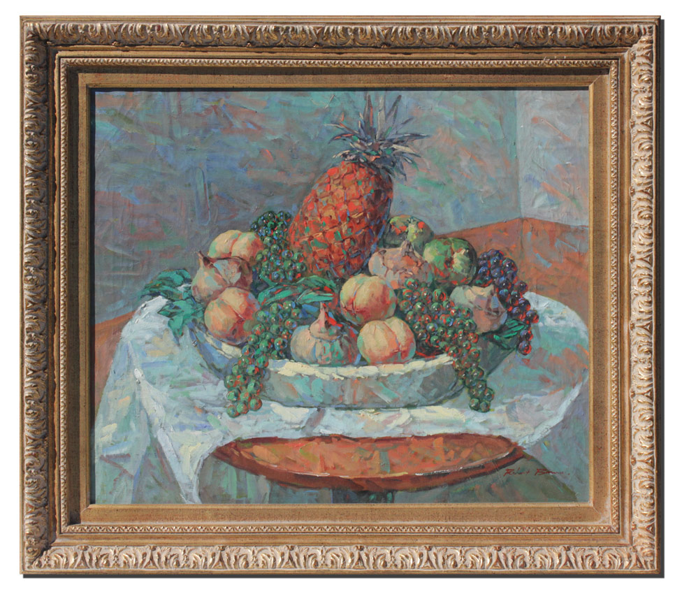 GOOD ILLEGIBLY SIGNED STILL LIFE PAINTING OF FRUIT: Oil/Canvas, 20'' x 24'', illegibly signed lower right, Robert Brown?, gilded frame with wear, 26'' x 30''.