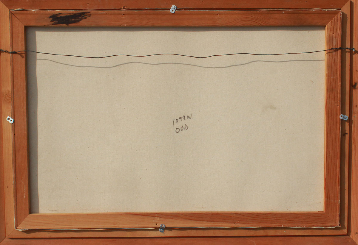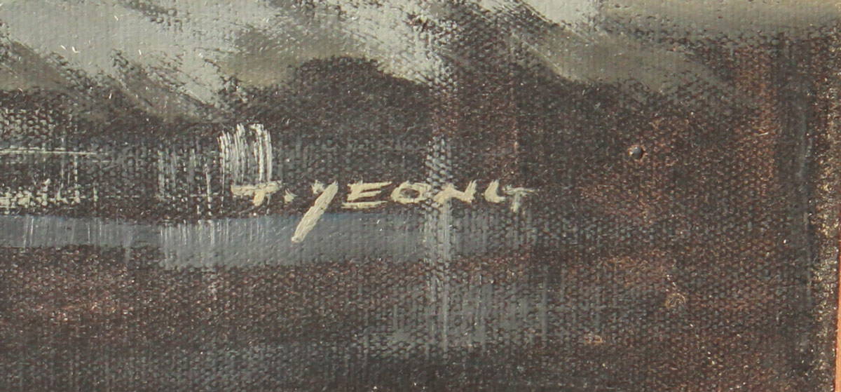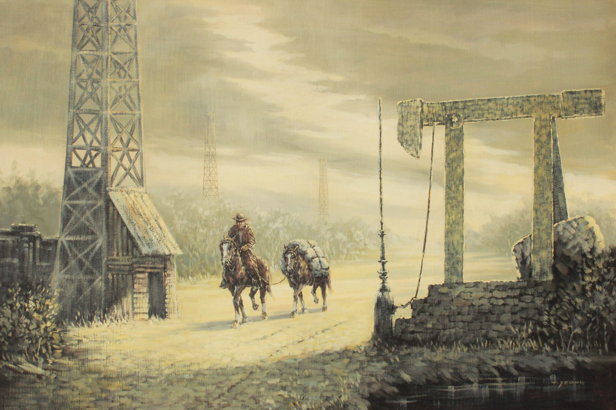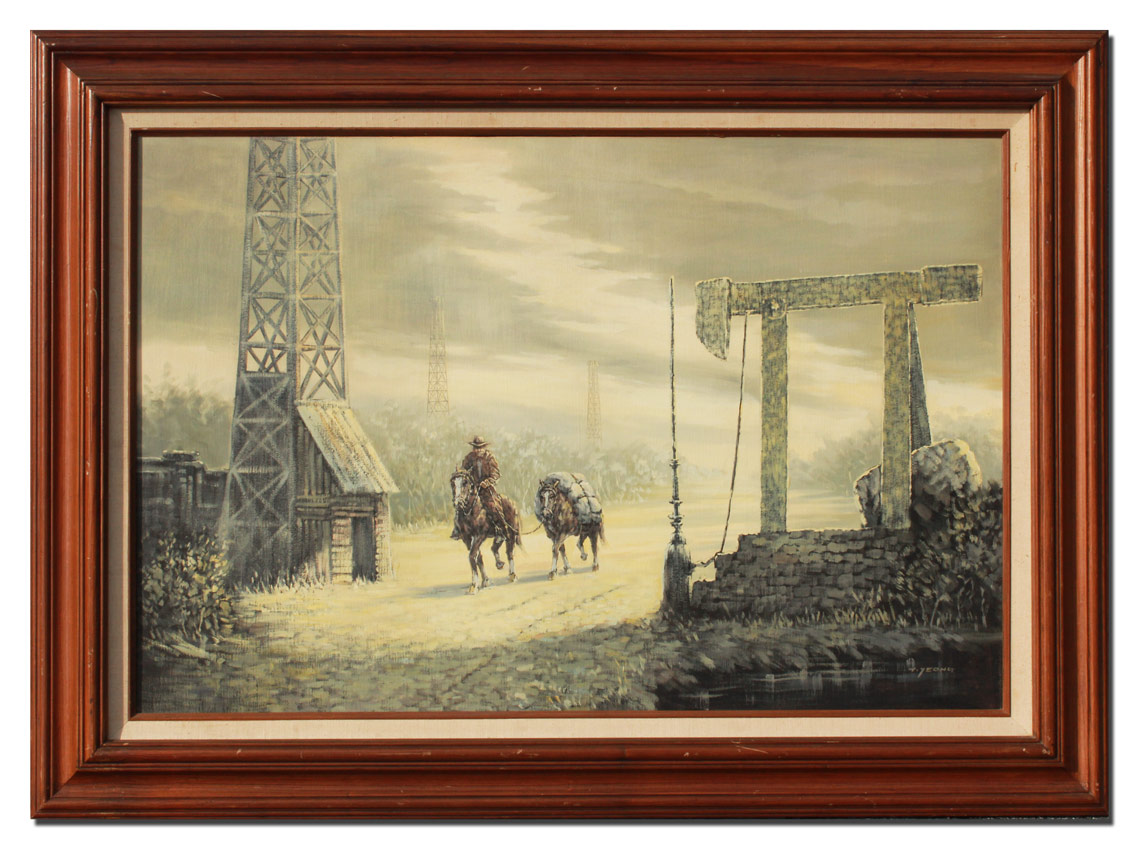 ILLEGIBLY SIGNED GHOST TOWN PAINTING: Oil/Canvas, 24'' x 36'', signed lower right, T. Yeong? Scene depicts an old miner walking with horse and burrow in an old oil town, framed 32 1/2'' x 44 1/2''.