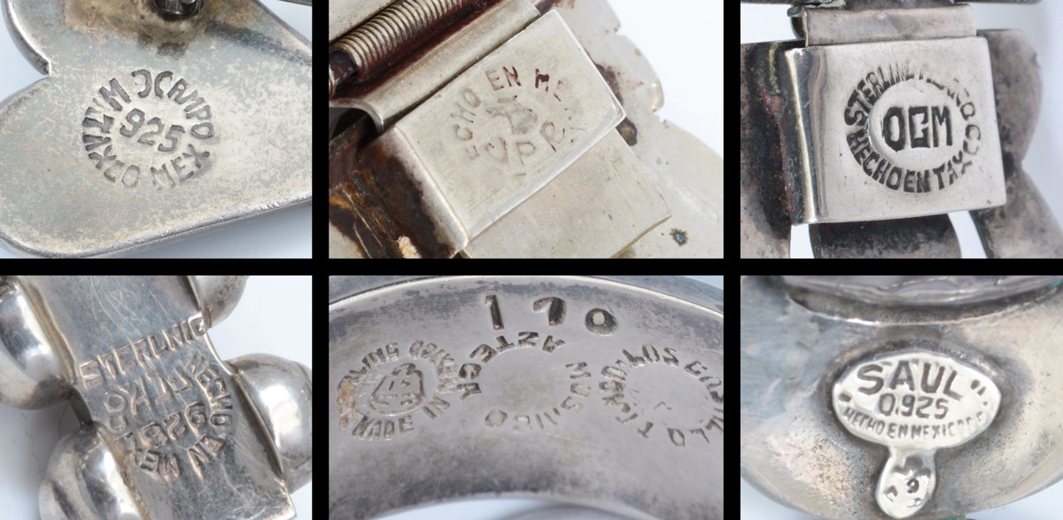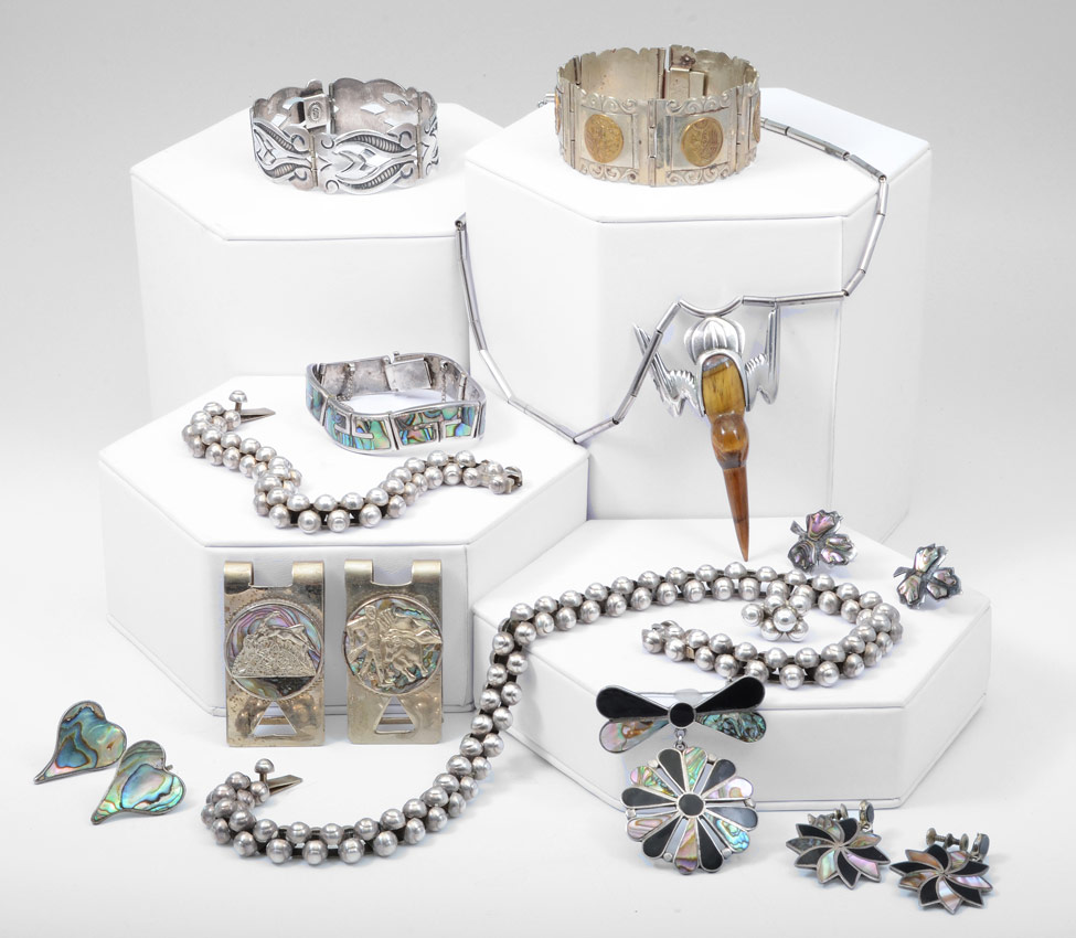 ESTATE TRAY LOT OF MEXICAN STERLING JEWELRY: To include, Los Castillo Mosaico Azteca bracelet, links inlaid with abalone, approx. 7''l., 1.2 troy oz; Saul sterling and carved tiger eye bird necklace, 19'', 1.4 troy oz.; Open link bracelet marked OCM Hencho en Taxco Mexico Sterling, 7''l., 1 Troy oz; Matching necklace, bracelet and single screw back earring, marked GCH, 15 1/4'' and 8''l, 2.66 troy oz. total; Panel bracelet marked JPP? Hencho en Mexico, no metal mark, each panel set with brass plaque with different design, 7'', 1.4 Troy oz.; Money clips - 2 sterling clips marked MAP, one with bull fight design, the other with astrological?, together 1.35 Troy oz; M. Ocampo abalone and onyx inlaid brooch and earrings; plus two other pair of earrings inlaid with abalone. Sold as a lot.