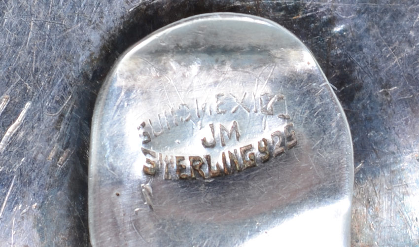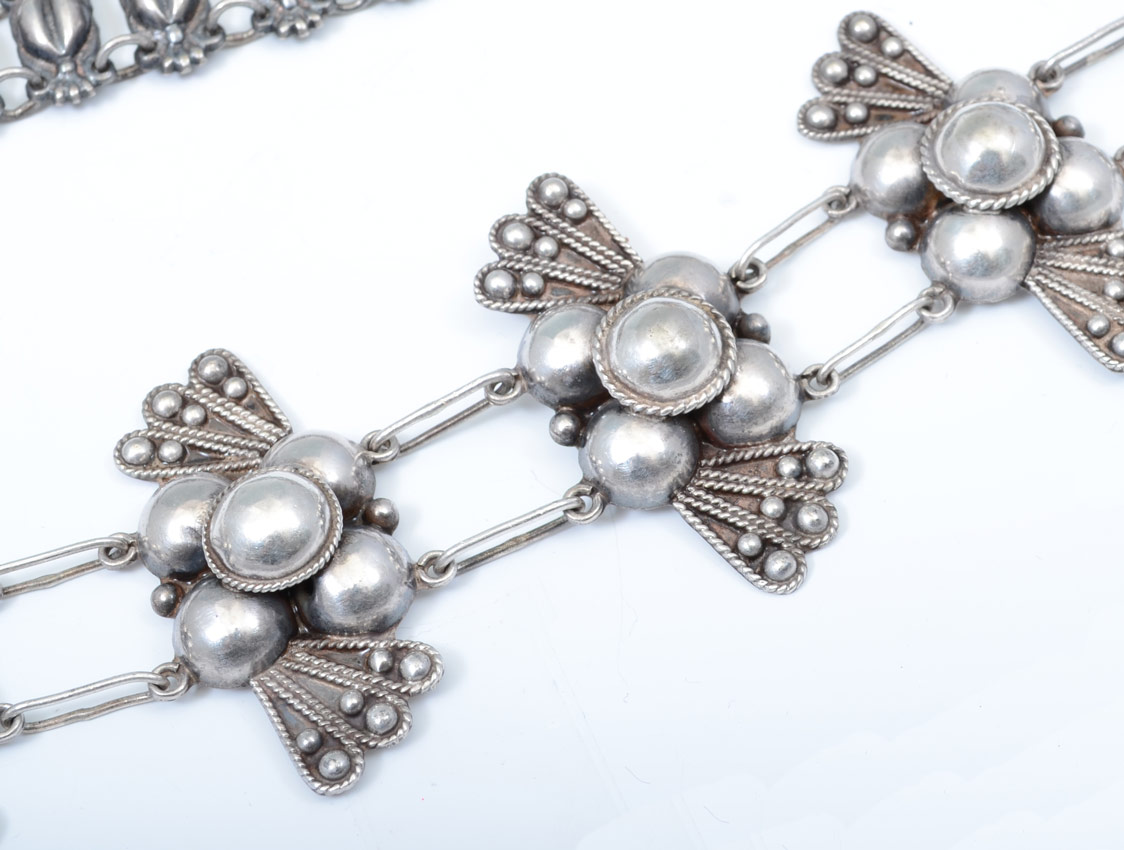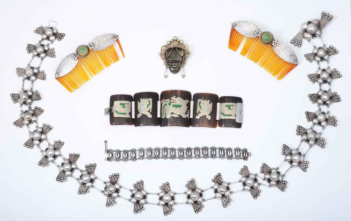 ESTATE TRAY LOT OF MEXICAN JEWELRY: To include, Belt marked JM, Sterling, AIM over 925 31 3/4'', 4.5 Troy oz; Brooch with carved stone face; Large hair combs set with green stones marked Silver Mexico; Diminutive multi link bracelet only marked Mexico, 7 1/2''l.; and an unmarked bracelet of horn? panels set with unknown silver metal and green, pale green and red inlaid materials, approx. 7 1/2''l. Sold as a lot.