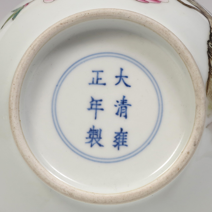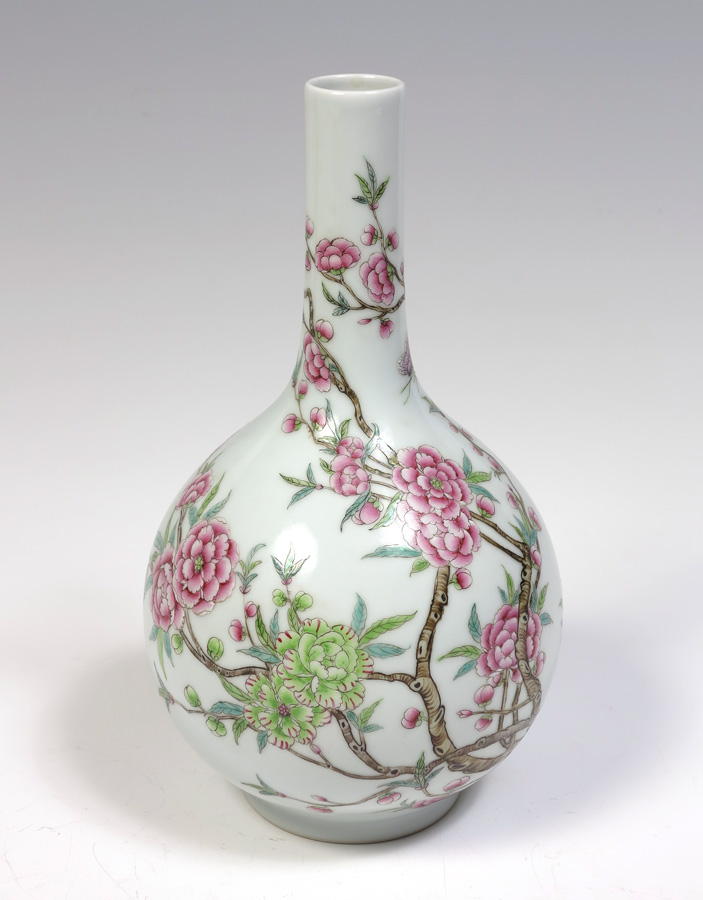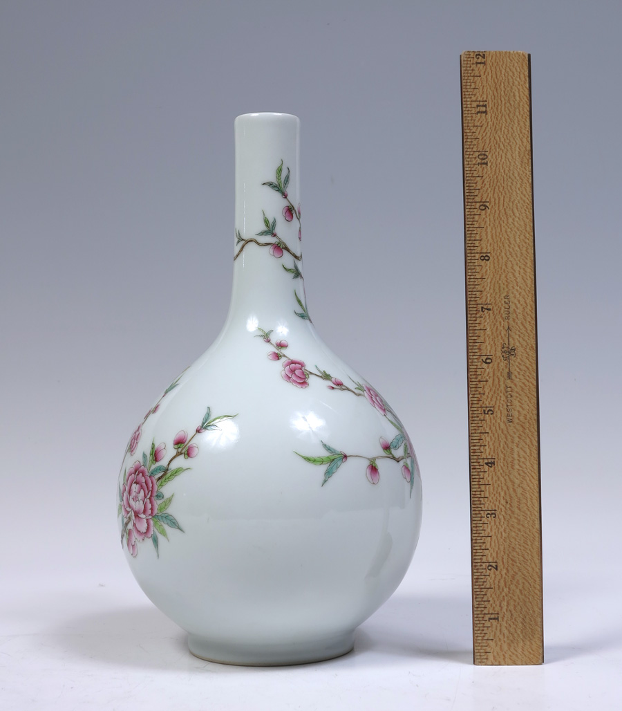 CHINESE PORCELAIN BOTTLE VASE: Hand painted peach blossoms, blue character marks, 11'' tall. Actual age unknown.