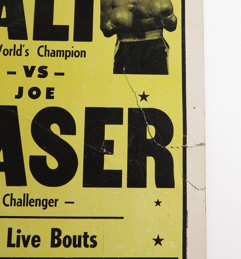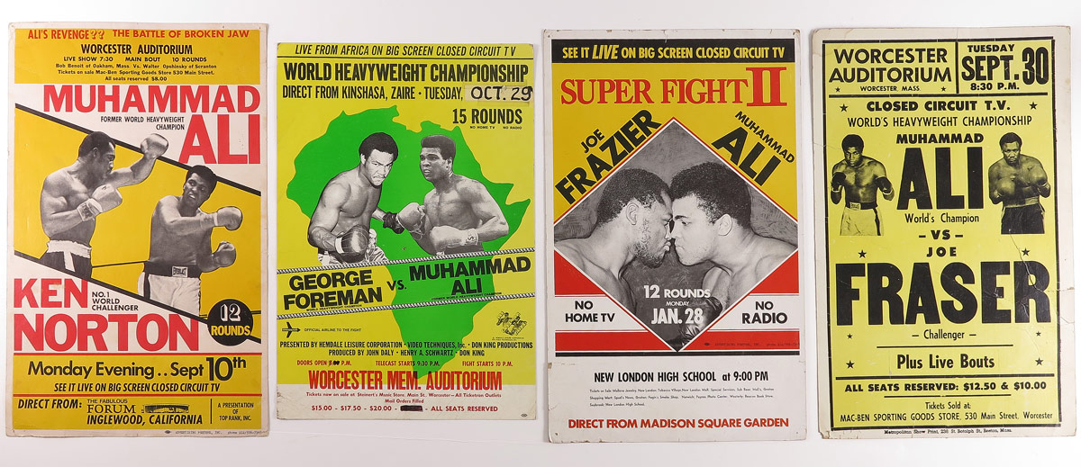4 MUHAMMAD ALI ADVERTISING POSTERS: 4 advertising posters printed on cardboard for closed circuit events in the Worcester, Mass area. Posters to include George Forman in Zaire, Joe Frazier in Madison Square Garden, Ken Norton in Inglewood, California, Joe Fraser (spelled incorrectly) dated Tuesday Sept 30, location not disclosed but most likely for the Thrilla in Manila. Largest measures 22'' x 14''.