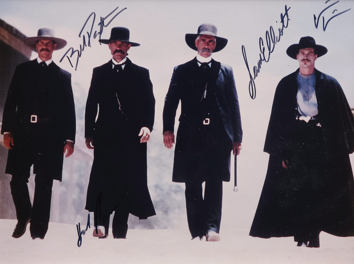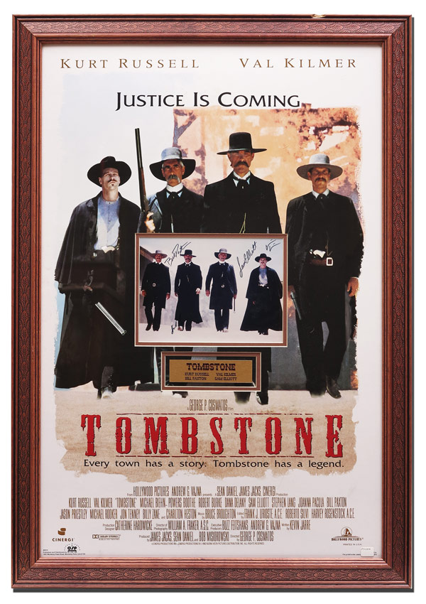 CAST SIGNED TOMBSTONE MOVIE STILL: From the 1993 theatrical release, autographs include Bill Paxton, Kurt Russell, Sam Elliot and Val Kilmer. Theatrical poster has been cut out in center to frame signed still and plaque. Sight size 34 1/2'' x 22 3/4'', framed 38 1/2'' x 26 3/4''.
