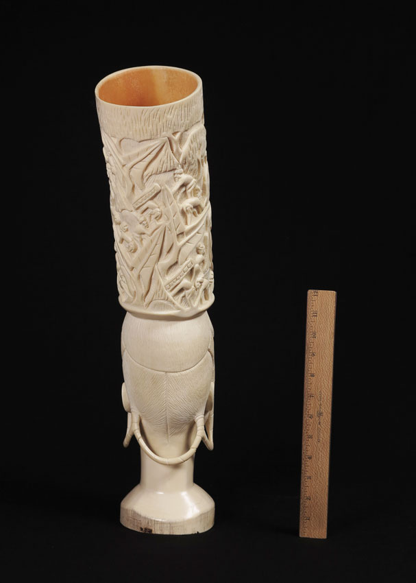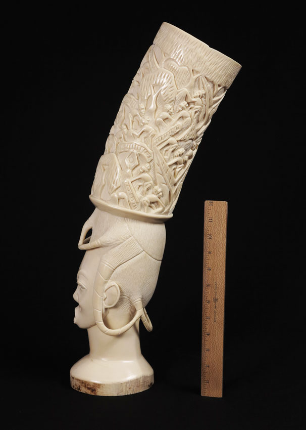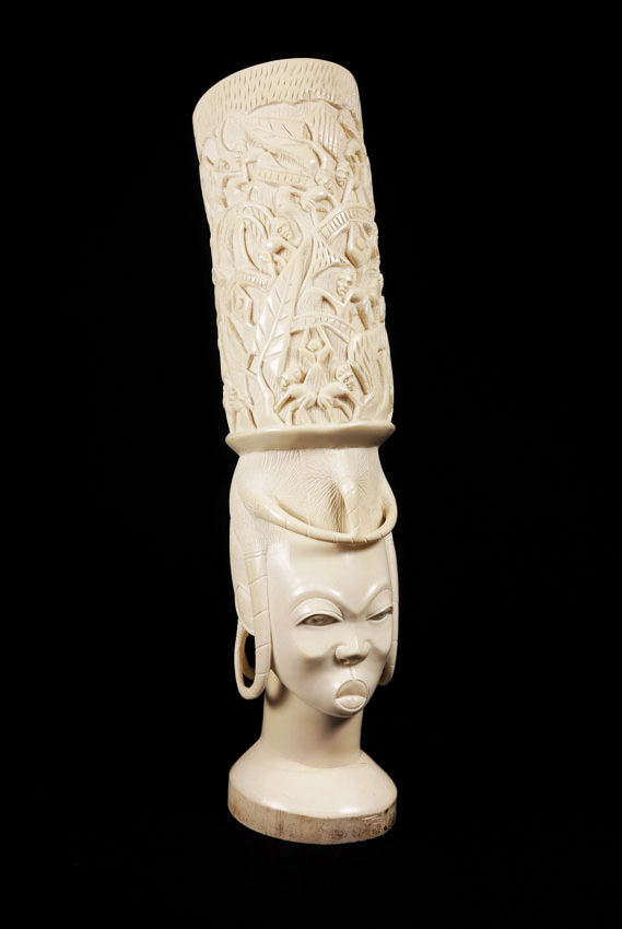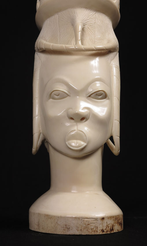 LARGE CARVED AFRICAN IVORY FIGURAL BUST: Carved from a single piece, top head piece with figural men in trees. Base female bust with extending hair pieces. 22 3/4'' h. x 10''. Approx. 10.5 lbs. See similar bust next lot.