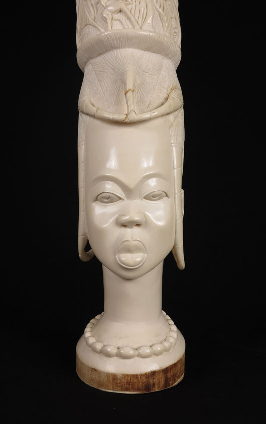 LARGE CARVED AFRICAN IVORY FIGURAL BUST: Carved from a single piece, top head piece with figural men in trees. Base female bust with extending hair pieces. 22 3/4'' h. x 10''. Approx. 12 lbs. See similar bust previous lot.